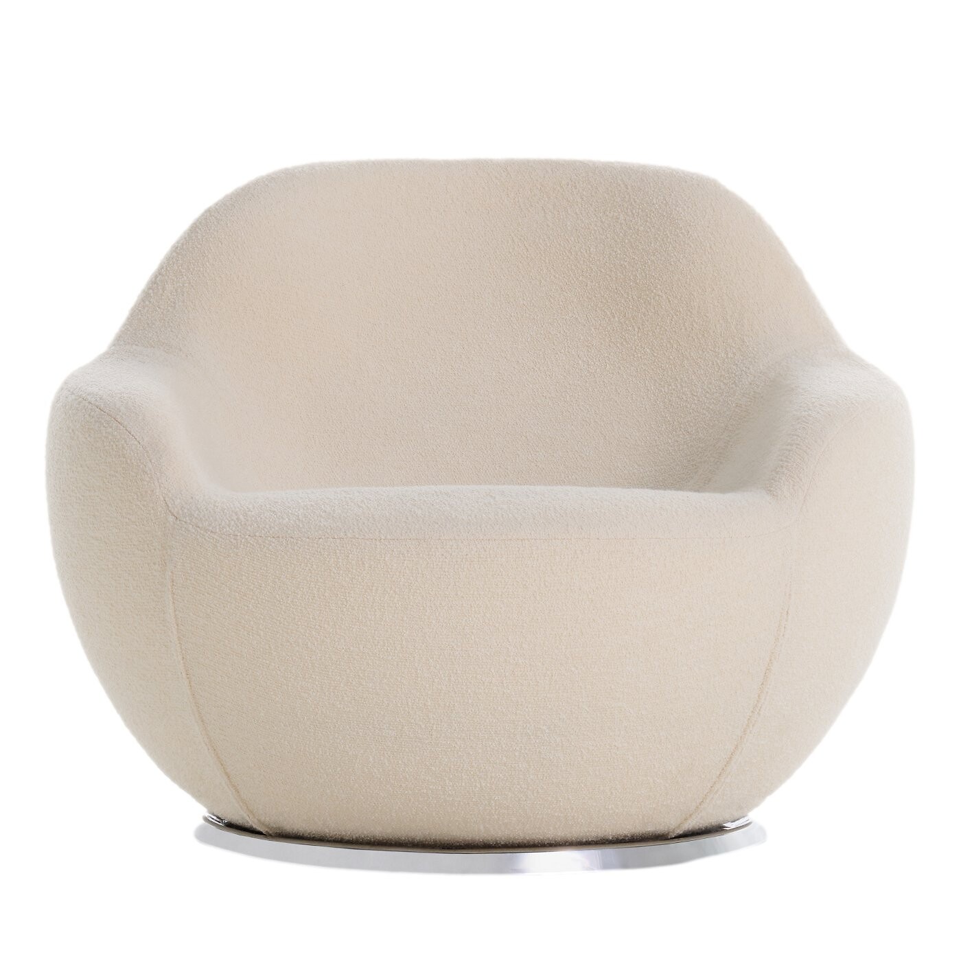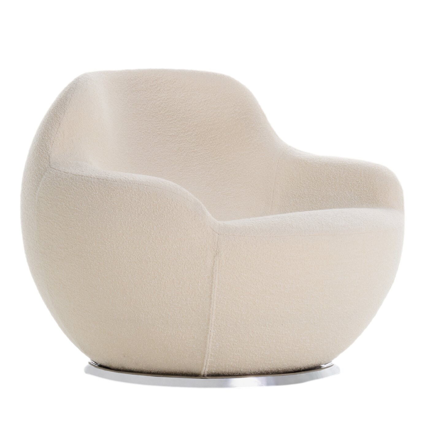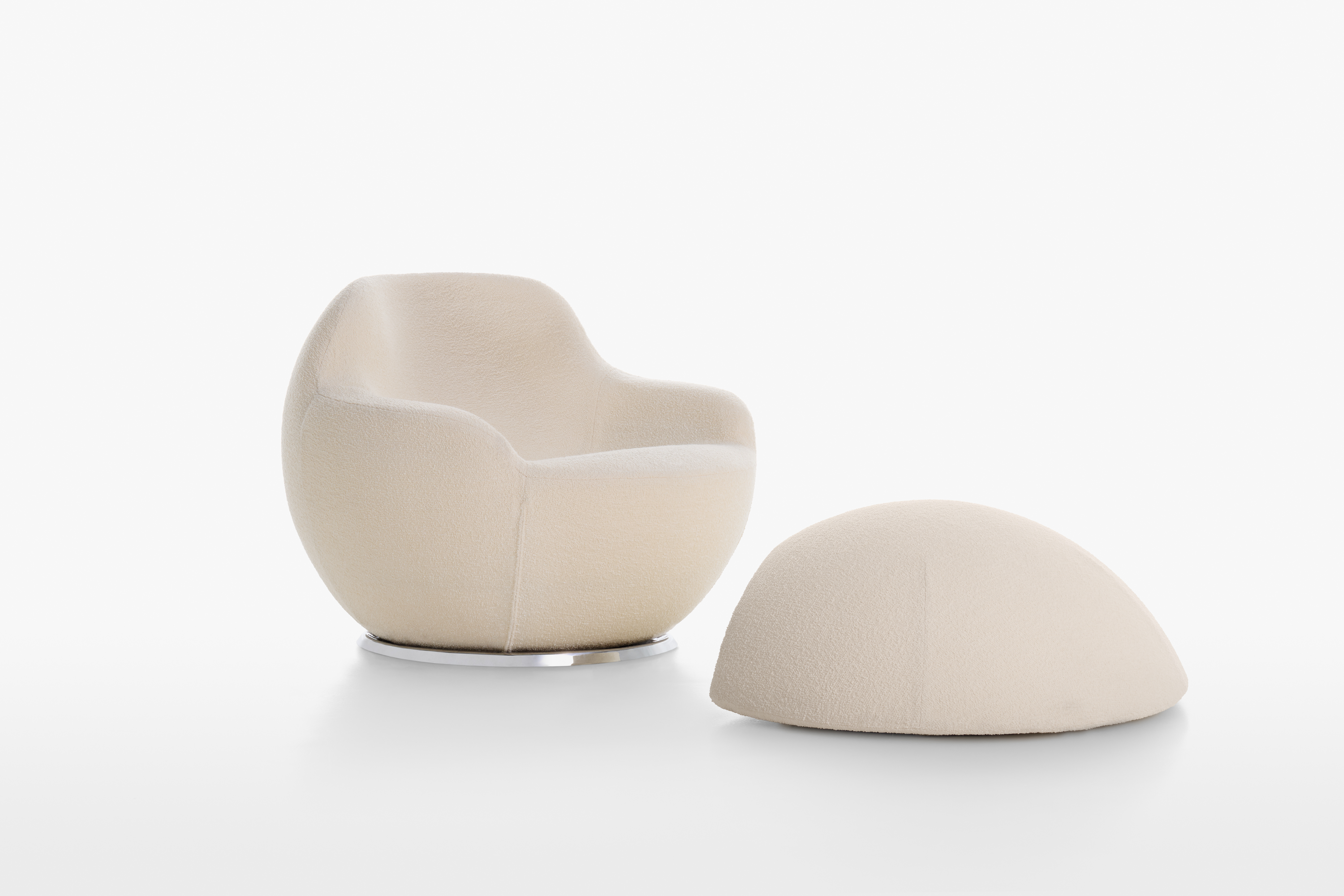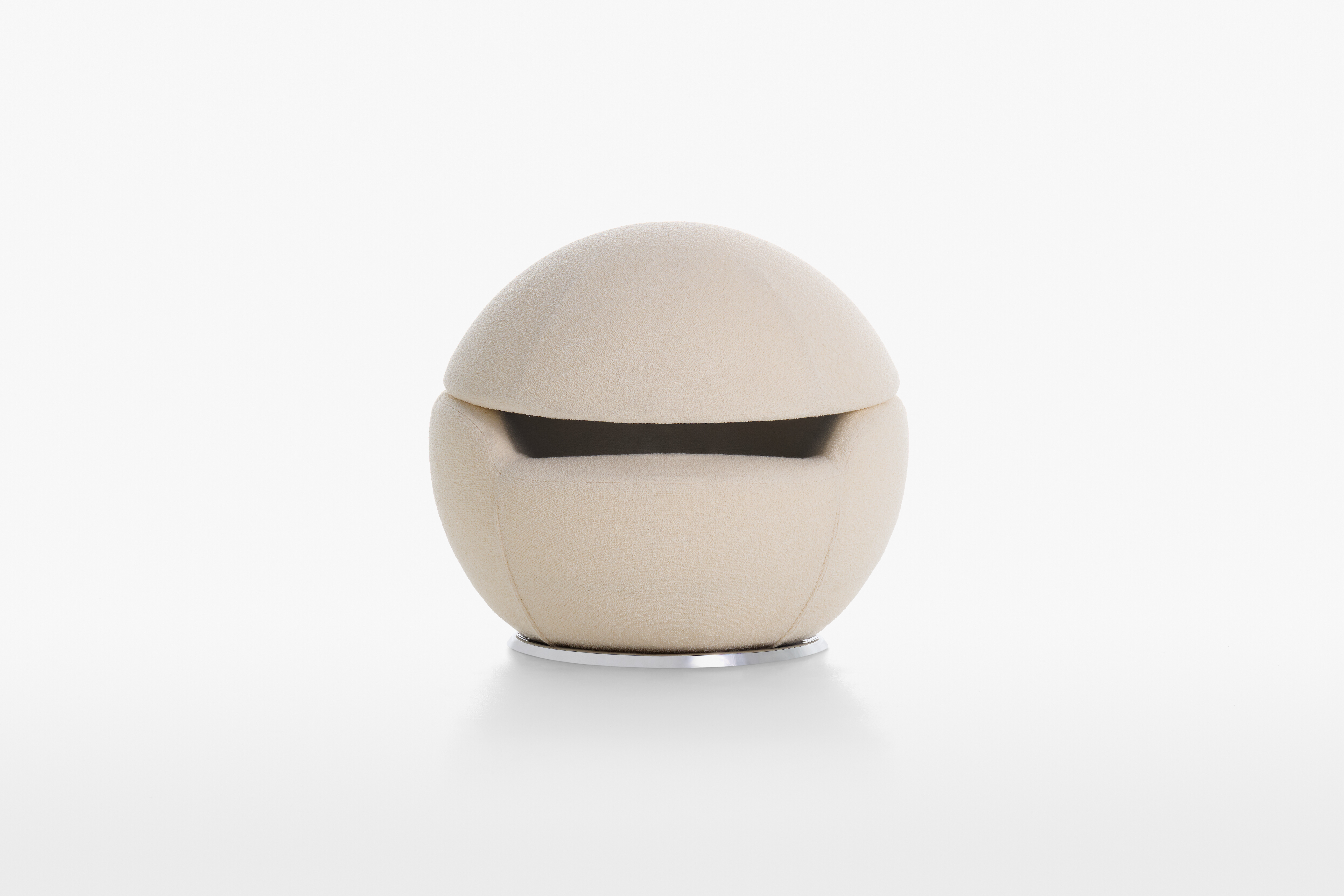Ausgehend vom Volumen einer Kugel entwickelte Salocchi ein Möbelstück, das Funktion und Ästhetik in Einklang bringt. Der Sessel wird durch ein passendes Fußteil ergänzt, das sich harmonisch einfügt und eine spielerische, zugleich elegante Wirkung erzeugt. Großzügige Polsterungen und die präzise Verarbeitung sorgen für hohen Komfort, während die klare Formensprache den radikalen Entwurf unterstreicht.
