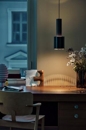 Die zeitlose Pendelleuchte A110 wurde von Alvar Aalto designt und ist in vier Varianten erhältlich. Ihr polierter Stahlring bringt einen zusätzlichen, hübschen Lichteffekt.