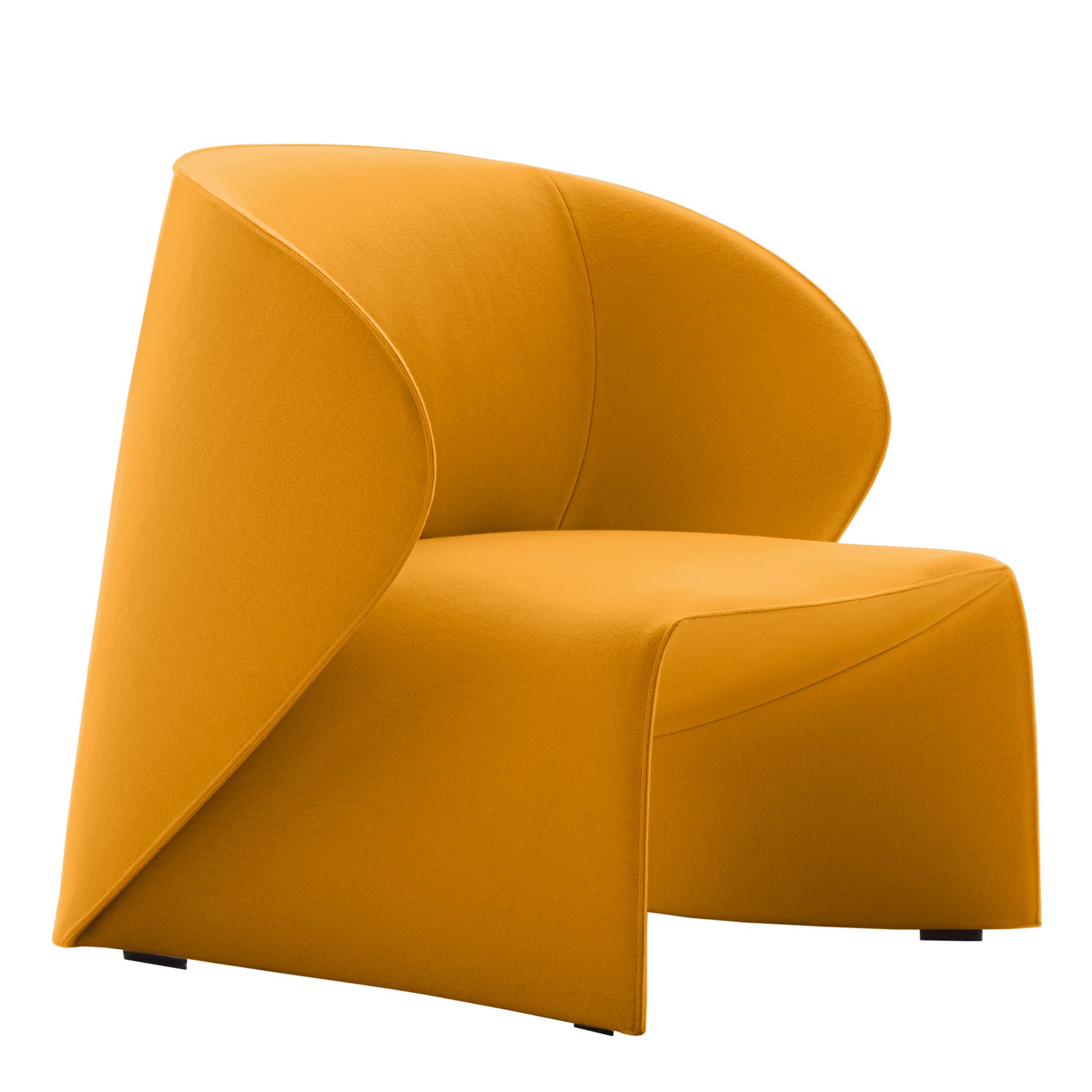 Das Design des Sessels erinnert an gefaltetes Origami, mit fließenden Formen, die sich harmonisch aus zwei ineinander greifenden Flächen ergeben und auf elegante Weise Volumen schaffen. Die Polsterung aus grobem, geschnittenem Filz und die sorgfältigen Details verleihen dem Sessel eine handwerkliche Raffinesse. Diese Verschmelzung von organischen Formen und digitalen Einflüssen reflektiert den modernen Zeitgeist, in dem traditionelle und futuristische Elemente aufeinandertreffen.