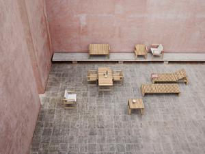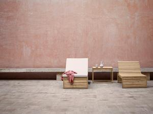Dieses Möbel ist Sonnenliege, Bank und Couchtisch zugleich. Die Funktion der neigbaren Kopfstütze ist versteckt.