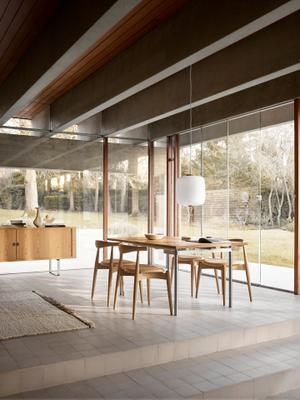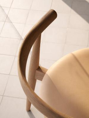 Die einzigartige Schienenkonstruktion unter der Sitzfläche, gefertigt aus formgepresstem Furnier, verleiht dem Stuhl eine schwebende Leichtigkeit bei gleichzeitig hoher Stabilität. Diese raffinierte Konstruktion macht den CH20 nicht nur elegant, sondern auch funktional – und sogar stapelbar, was ihn besonders praktisch für flexible Wohn- und Arbeitsräume macht.
