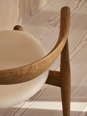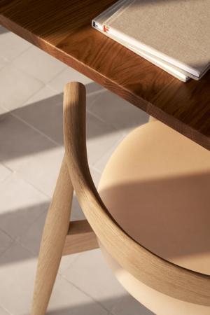 Besonders markant ist die dampfgebogene Rückenlehne aus einem einzigen Stück Massivholz, die dem Stuhl nicht nur seinen Namen verleiht, sondern auch vielseitigen Sitzkomfort bietet. Sie stützt Ellbogen und unteren Rücken und erlaubt gleichzeitig verschiedene entspannte Sitzhaltungen.