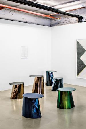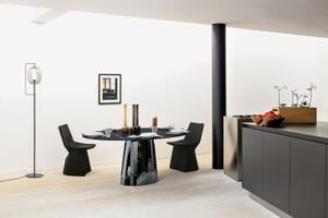 Die vier verschiedenen Farbvariationen entstehen durch eine unterschiedlich lange Oberflächenbehandlung. Tischplatte und Fuß als ovale Form stehen im Kontrast zu den geradlinigen Facetten des Fußes.