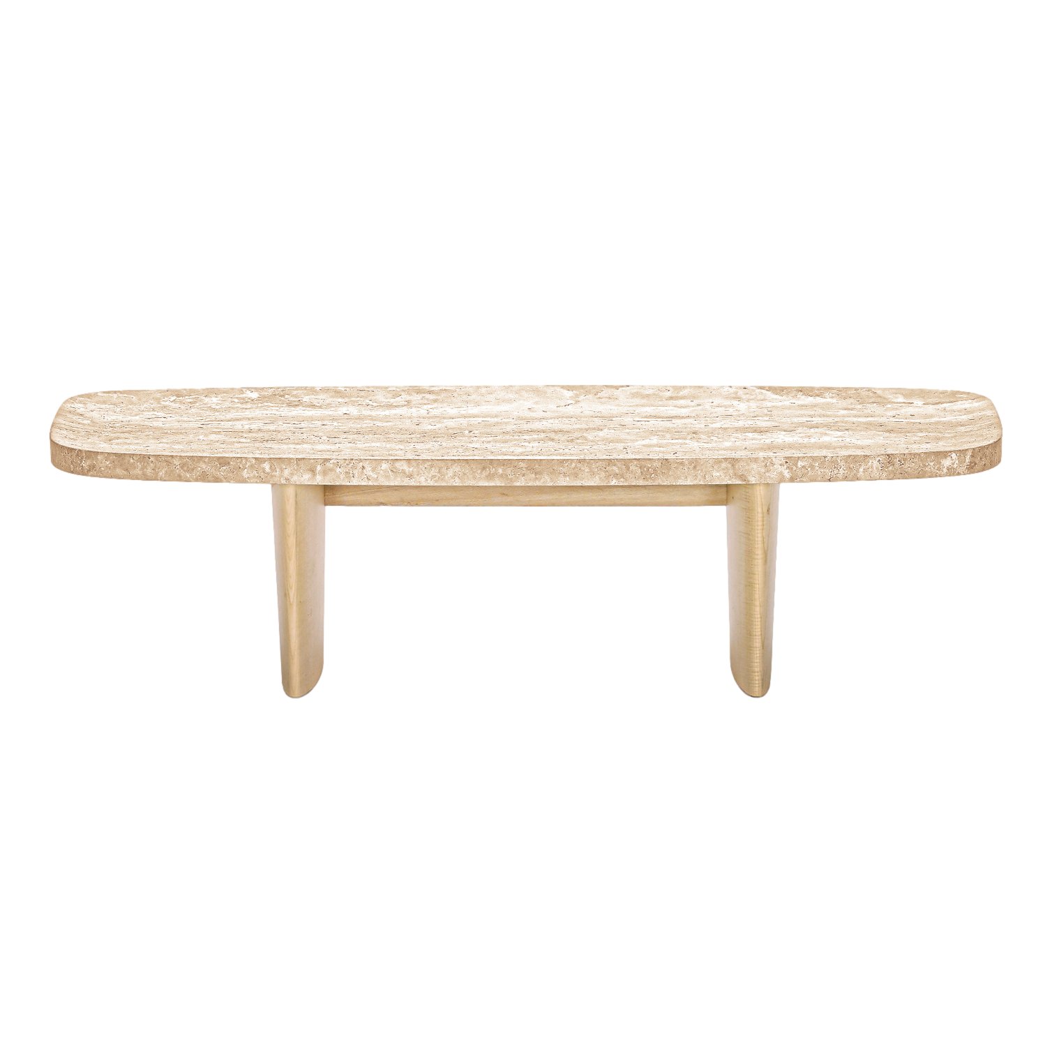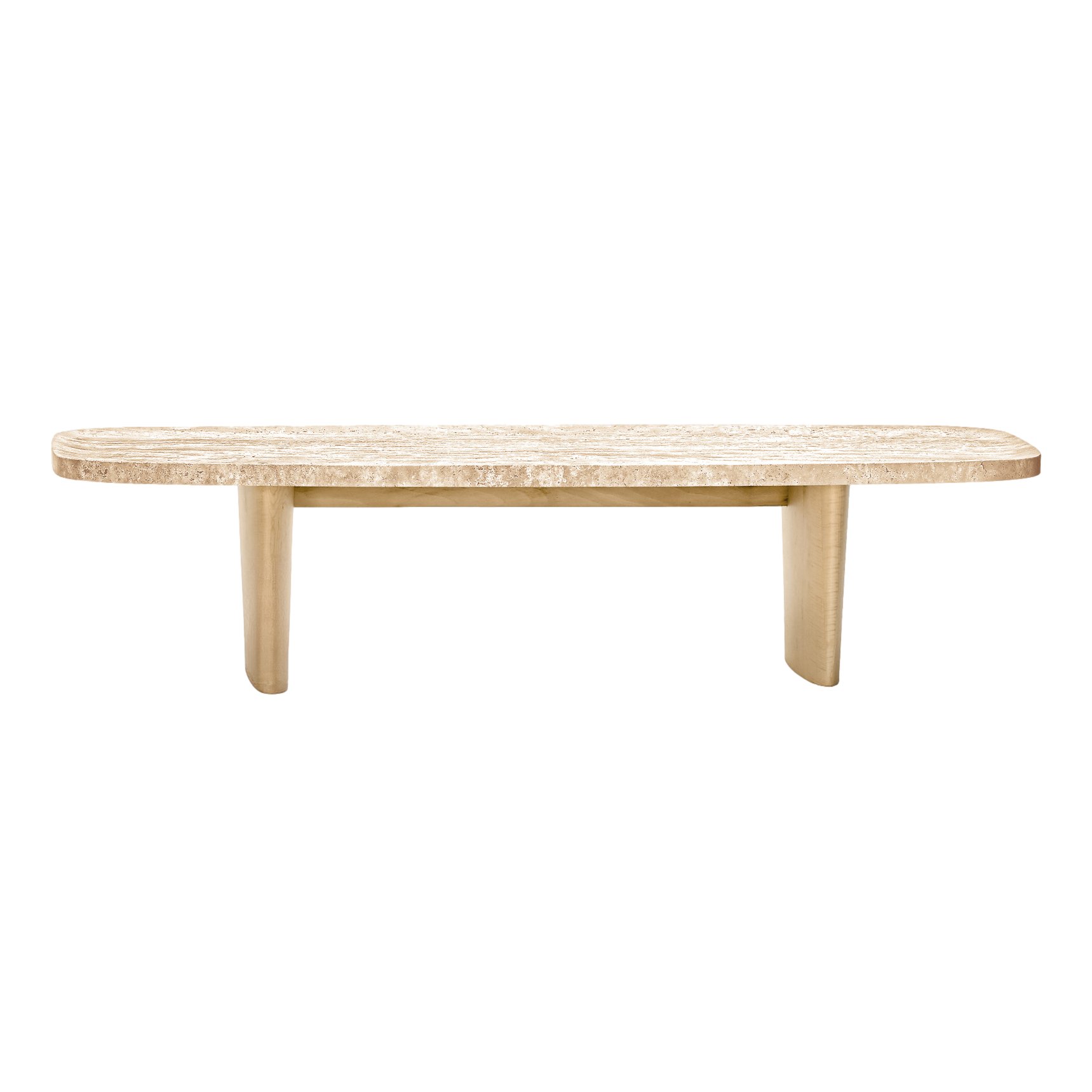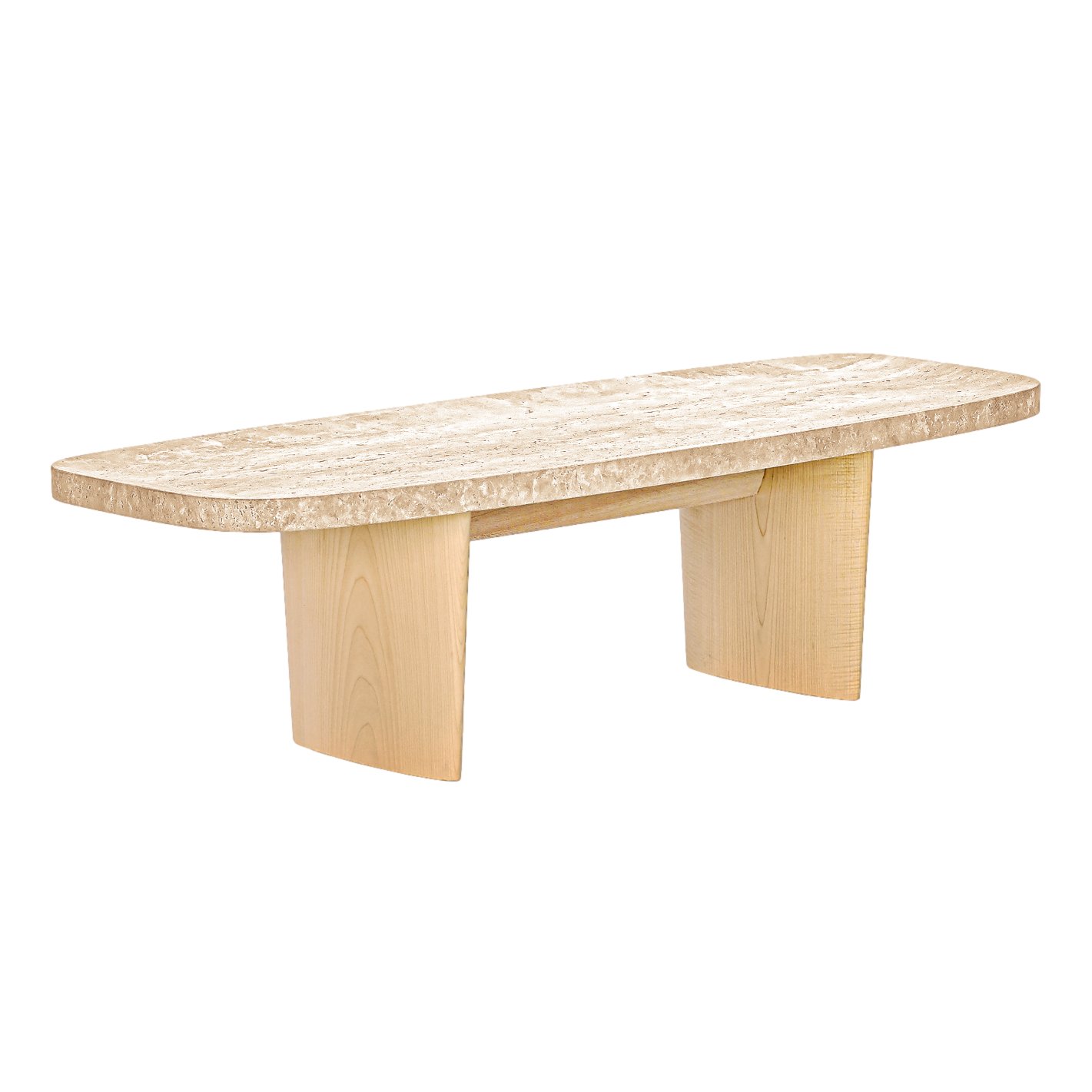 Der Matéria Beistelltisch vereint edle Materialien mit einer durchdachten, handwerklichen Verarbeitung. Das Gestell besteht aus massivem Ahorn, naturbelassen und klar lackiert, um die natürliche Maserung des Holzes schön zur Geltung zu bringen. Die Tischplatte aus Travertin ist ein besonderes Highlight – entweder in ihrer natürlichen Form oder mit indigo gefärbten Vertiefungen, die dem Tisch einen modernen Touch verleihen.