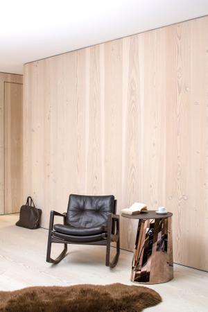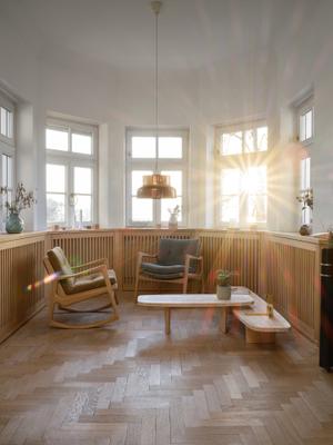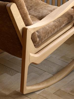 Der Schaukelsessel Euvira von Jader Almeida ist ein bequemer Begleiter. Durch die niedrige Rückenlehne bleibt der Sessel zurückhaltend und zierlich.
