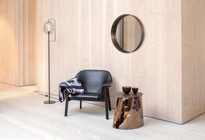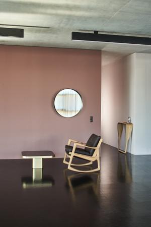 Harmonisch ausgeformte Radien und ein Messingrahmen erinnern an die Eleganz der 50er Jahre. Die österreichische Architektin Nina Mair lässt den Cypris Spiegel seitlich betrachtet mit Präsenz und einem ausdrucksstarken Rahmen erstrahlen.