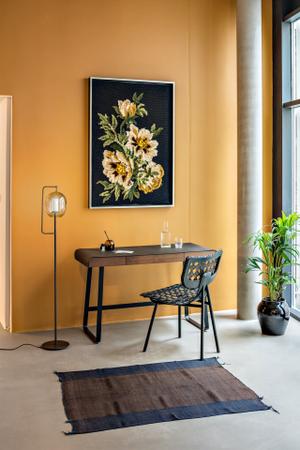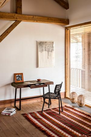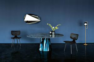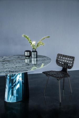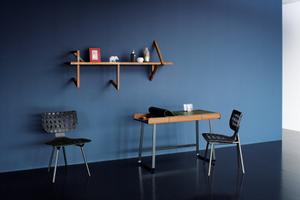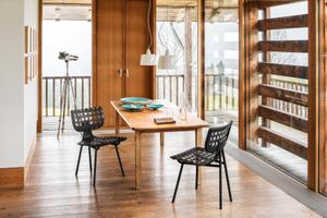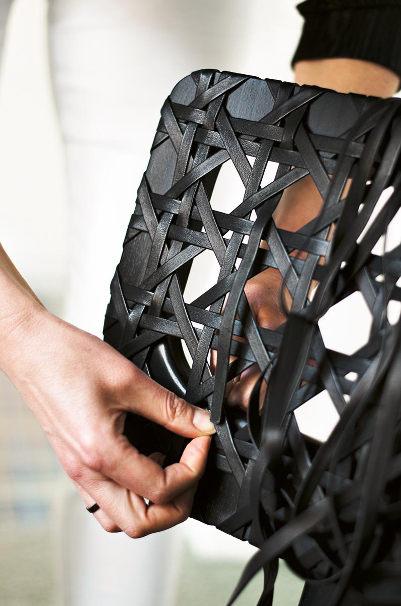 Das klassische Wiener Geflecht wird bei der Serie Aërias auf moderne Art neu interpretiert. Die Vergrößerung des traditionellen Flechtmusters, das hier aus Lederschnüren entsteht, gibt dem Stuhl seinen eigenwilligen Charakter.