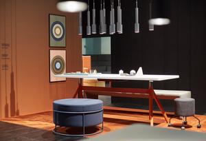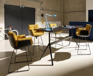 Einfache Verschraubungen ermöglichen es Tischplatte und –böcke schnell zu trennen. Der Tisch kann dort stehen, wo er gerade gebraucht wird. „Im Vergleich mit der bestehenden Kollektion ist der Werktisch ein Experiment“, erklärt der Designer Uwe Fischer, „etwas untypisch in der Formensprache, typisch in der Individualisierbarkeit und hochwertigen Ausführung.“ Dieser Tisch ist Arbeitstisch und Treffpunkt. Ein leicht zu transportierender Tisch, der trotzdem stabil ist, weil die Unterkonstruktion mit Zargengestell geliefert wird. Passend dazu wurde die Polsterbank Bridge entworfen.