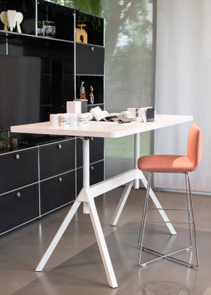 Der Tisch Level ist wie ein Stativ, nicht nur optisch, denn mittels eines Schnellspannsystems lässt sich die Höhe mühelos verstellen.
