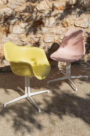 Die Oberflächen der Sitzschalen in verschiedenen Farben weisen wegen der Zusammensetzung des Recyclingwerkstoffs kleinste Sprenkel auf.