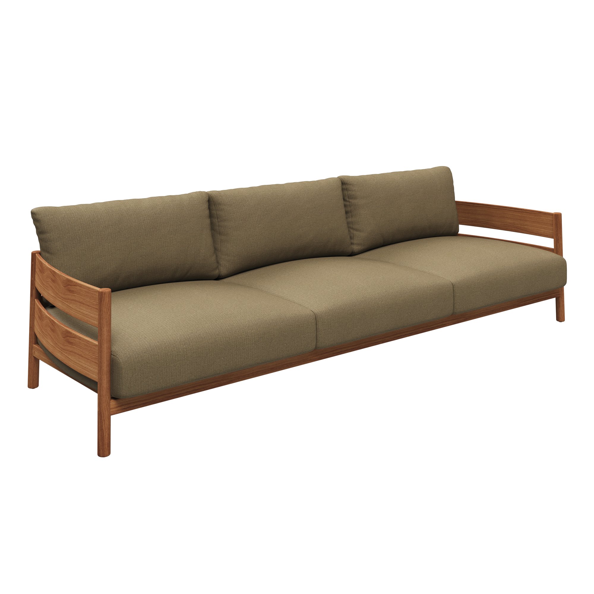 Die Haven Kollektion strahlt mit ihrem maritimen Flair und der Kombination aus robusten massiven Teakholzrahmen und tiefen, luxuriösen Sitz- und Rückenkissen eine einladende Atmosphäre aus. Die sanft geschwungenen Rücken- und Seitenteile sind so gestaltet, dass sie den Nutzer umarmen und ein behagliches Gefühl der Entspannung vermitteln.