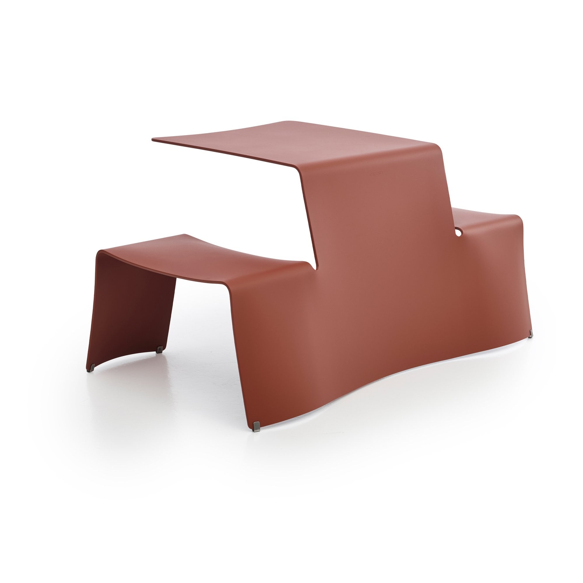 Die durchdachte Form des Picnik bietet zwei Personen an der Tischplatte bequem Platz und hält den härtesten Witterungsbedingungen im Freien stand. Die geschwungenen Rundungen des Designs ermöglichen zudem eine effiziente Wasserableitung, was den Picnik besonders für den Außenbereich geeignet macht.
