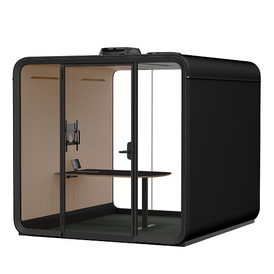 Flexibler Besprechungsraum für moderne Arbeitsumgebungen - Die Framery Six vereint die besten Eigenschaften eines großen Besprechungsraums in einem praktischen, modularen und flexiblen Format. Der luxuriöse und geräumige Innenbereich ist mit einem großen Besprechungstisch ausgestattet, der mit unterschiedlichen Sitzgelegenheiten ergänzt werden kann. Die niedrige Schwelle sorgt für einfachen Zugang, während das minimalistische Design und die sorgfältige Materialauswahl die Kabine zu einer nachhaltigen Wahl machen.