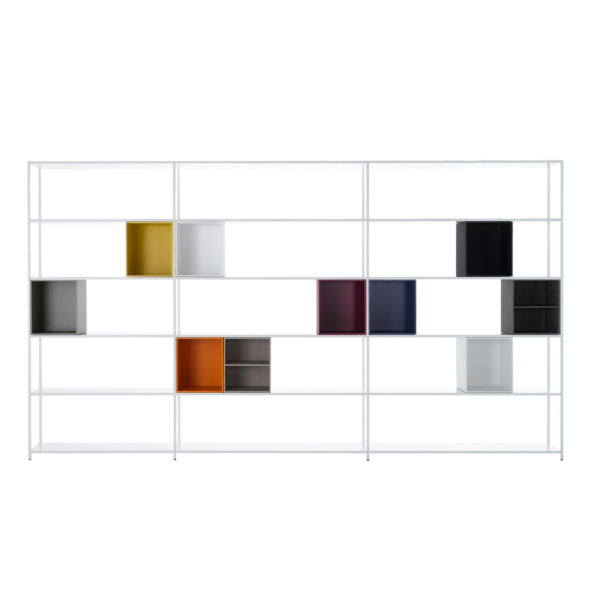 - offene Behälter Holzfaserplatte lackiert oder furniert: 1x senfgelb lackiert X048, 1x shadow grey lackiert, 2x mattweiß lackiert, 1x orange lackiert X047, 1x burgunderrot lackiert X163, 1x blau lackiert, 2x Holz grau mit zusätzlichen Einlegeböden und 1x Holz schwarz