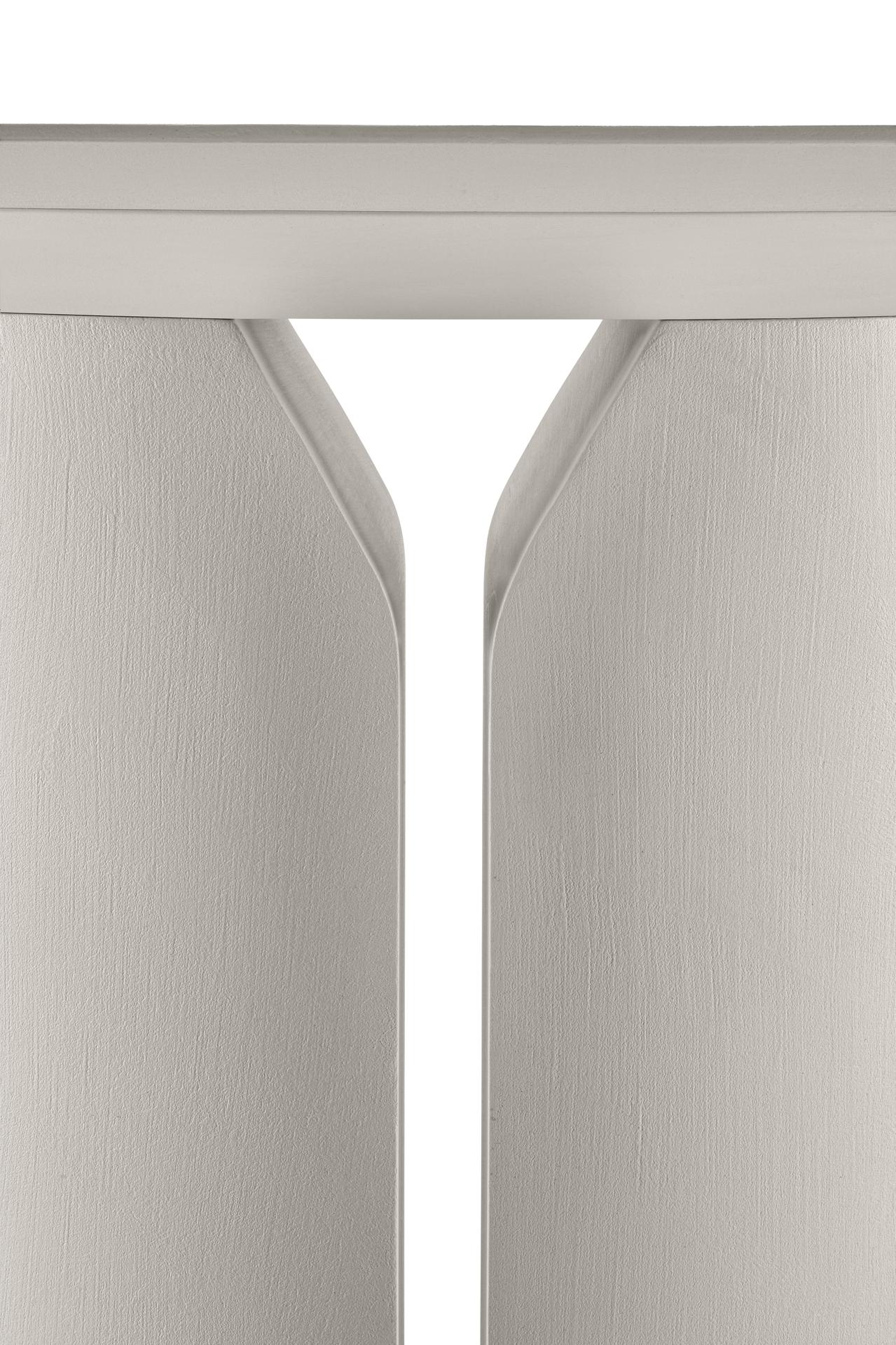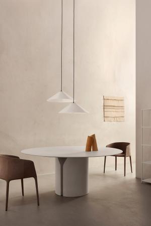 Ein Tisch wie eine Skulptur mit starker Raumpräsenz. Der NVL Tisch ist in verschiedenen Ausführungen erhältlich: Von lackiert bis Kunstmarmor. Tischplatte und Säule sind immer materialgleich.