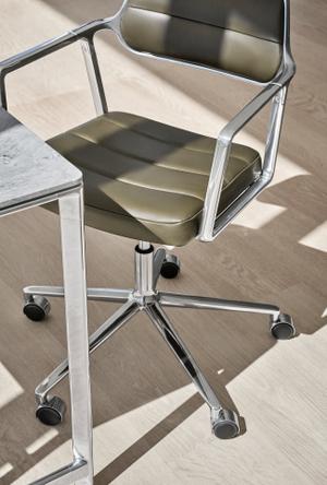Vipp präsentiert eine neue, extra gepolsterte Variante des beliebten Swivel Chair – den Swivel+. Diese höhenverstellbare Version des klassischen Drehstuhls wurde speziell für den Einsatz im Home Office und in Konferenzräumen entwickelt, in denen Menschen über längere Zeiträume bequem sitzen müssen. Der Swivel+ bietet eine größere Rückenlehne und einen besonders komfortablen Sitz, der für maximalen Sitzkomfort sorgt.