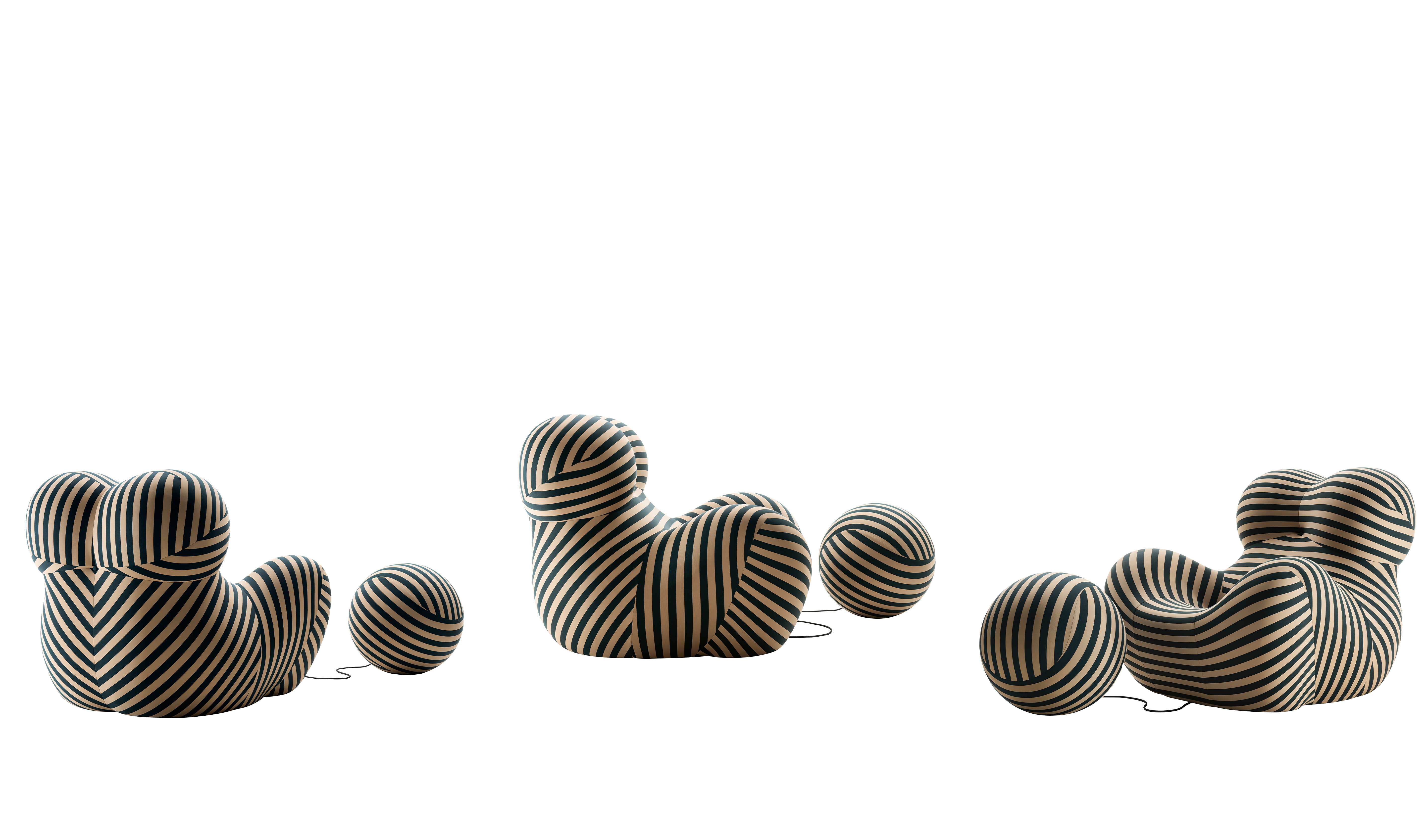 Mit dem Sessel UP schuf Gaetano Pesce einen großen Mutterschoß als Sitzmöbel, der Behaglichkeit und Komfort bietet. Pesce gefiel die Idee, dem Sessel einen Pouf mit Leine zu geben, der auch die andere Seite seines Frauenbildes verkörpert. Denn in der Vorstellung von Gaetano Pesce waren Frauen trotz allem auch Gefangene ihrer selbst.
