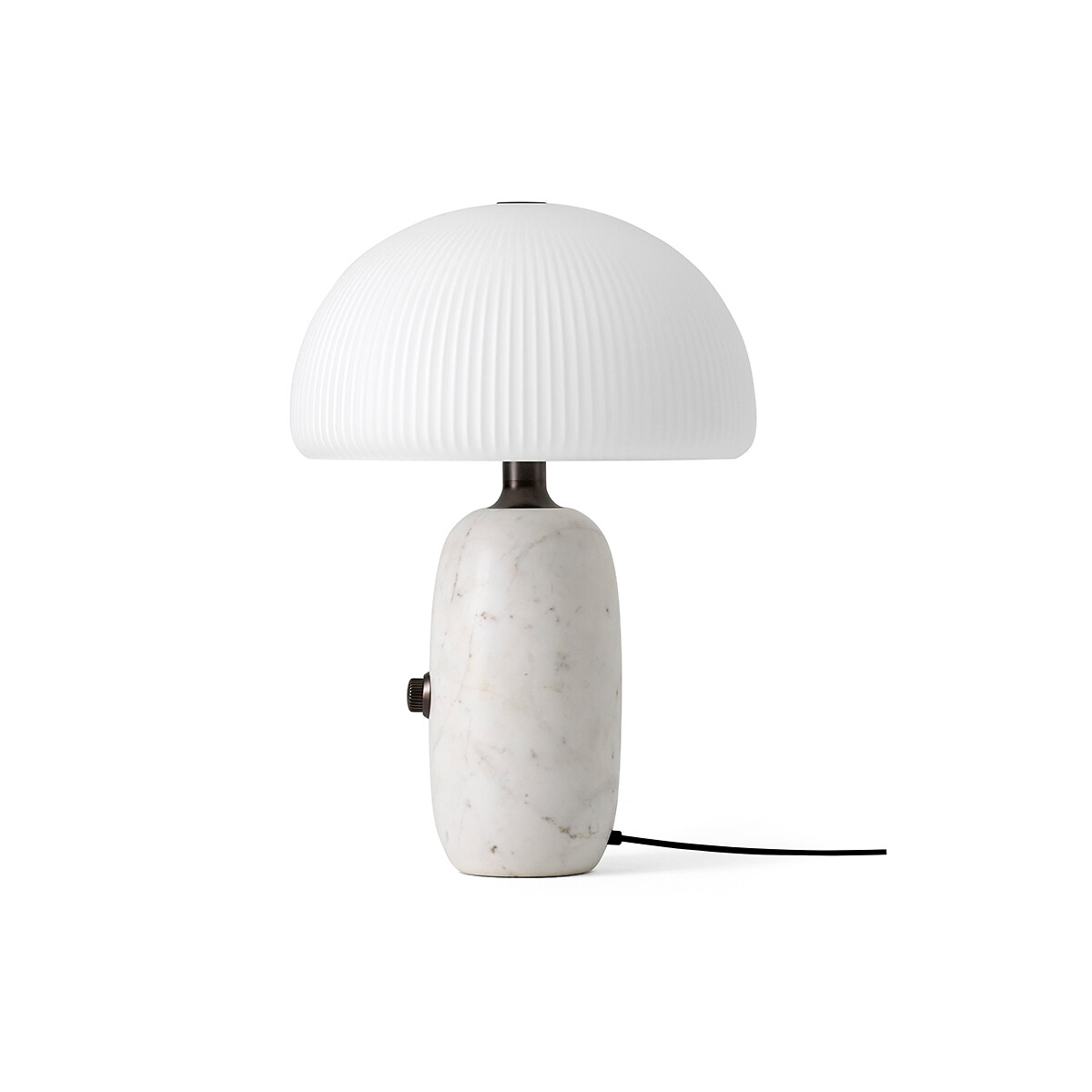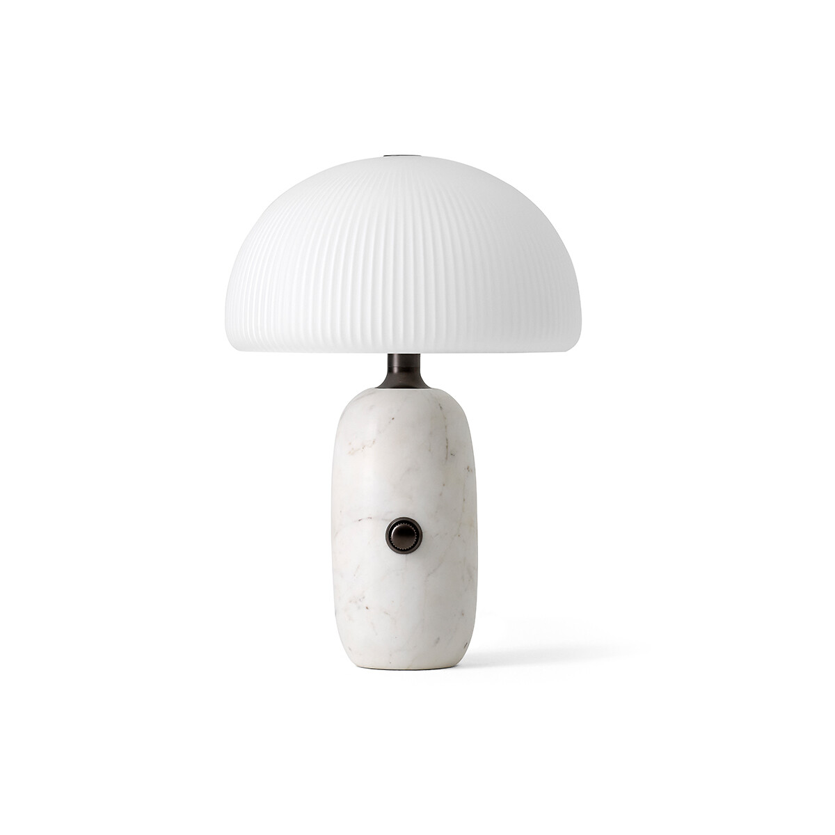 Der schwere Sockel aus Naturstein bildet einen spannenden Kontrast zum sanft leuchtenden, opalweißen Glasschirm. Dieser ist mundgeblasen und sorgt für ein angenehm diffuses Licht – perfekt für ruhige Abendstunden und atmosphärische Lichtakzente.
