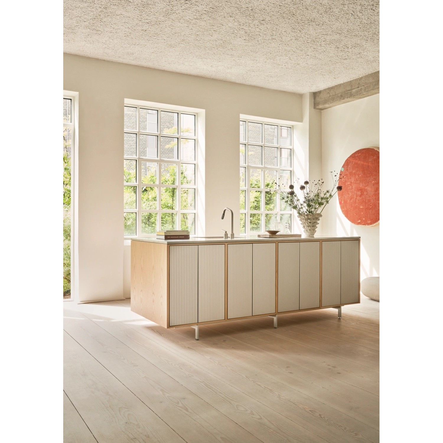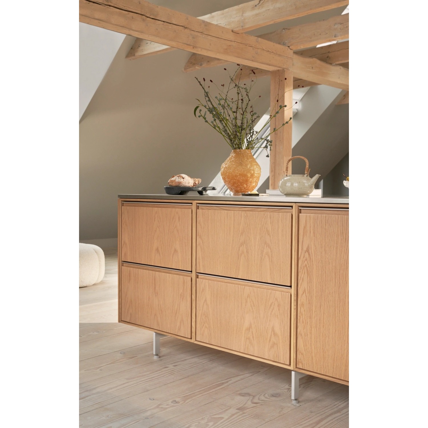 Die Vipp V2 verbindet industrielle Präzision mit einer warmen, reduzierten Materialität. Mit ihrer schlanken Silhouette interpretiert sie die charakteristische Designsprache von Vipp neu und verleiht ihr eine wohnlichere Note. Das klare, modulare Konzept bleibt erhalten, wird jedoch durch den Einsatz von Eichenfurnier sichtbar verfeinert. Inspiriert vom Vipp Küchenschranksystem ruht die Konstruktion auf einem pulverbeschichteten Stahlgestell mit filigranen Beinen. Die Kombination aus Fronten aus Eiche und Aluminium mit integrierten Griffen sowie einer Arbeitsplatte aus Edelstahl vereint handwerkliche Wärme mit funktionaler Präzision.