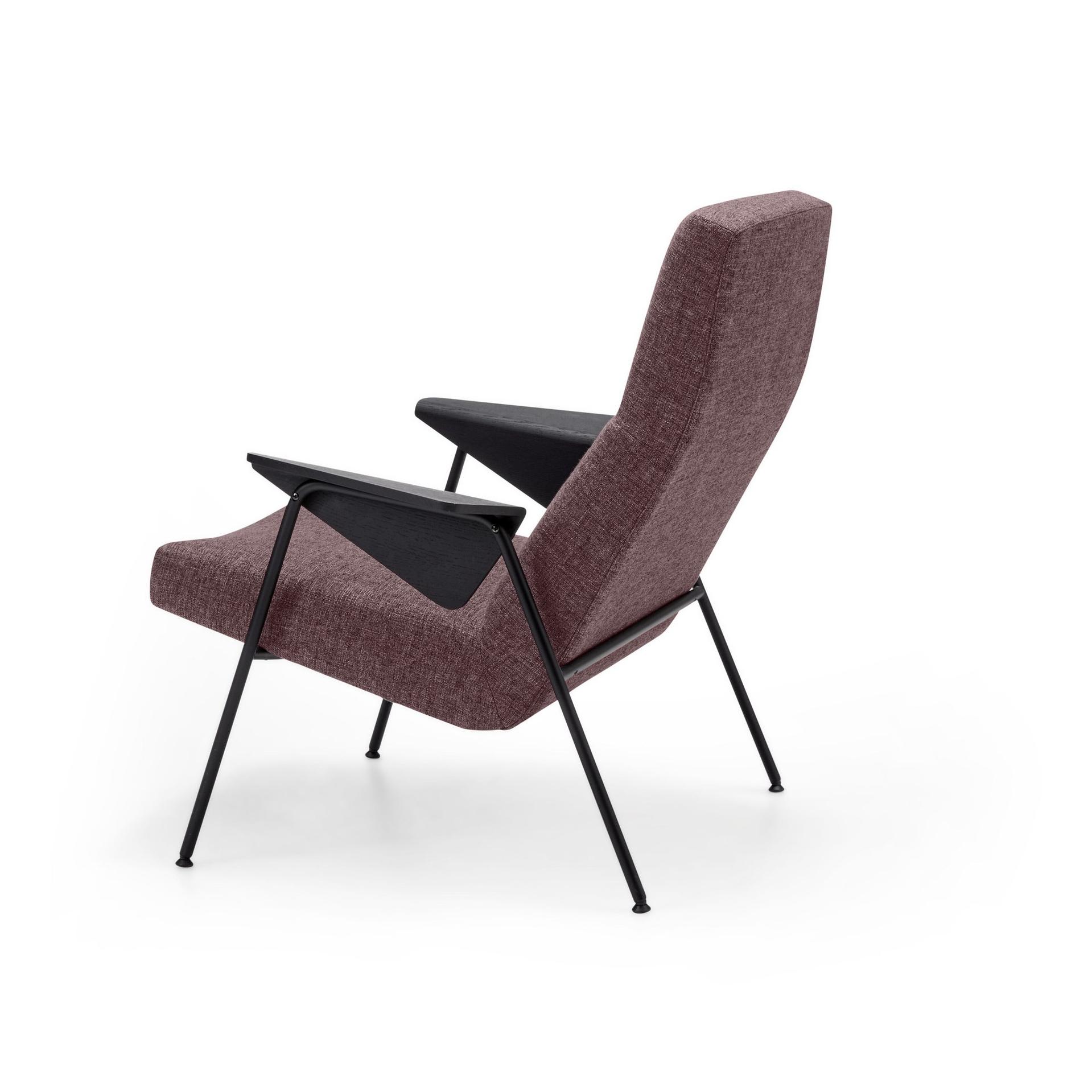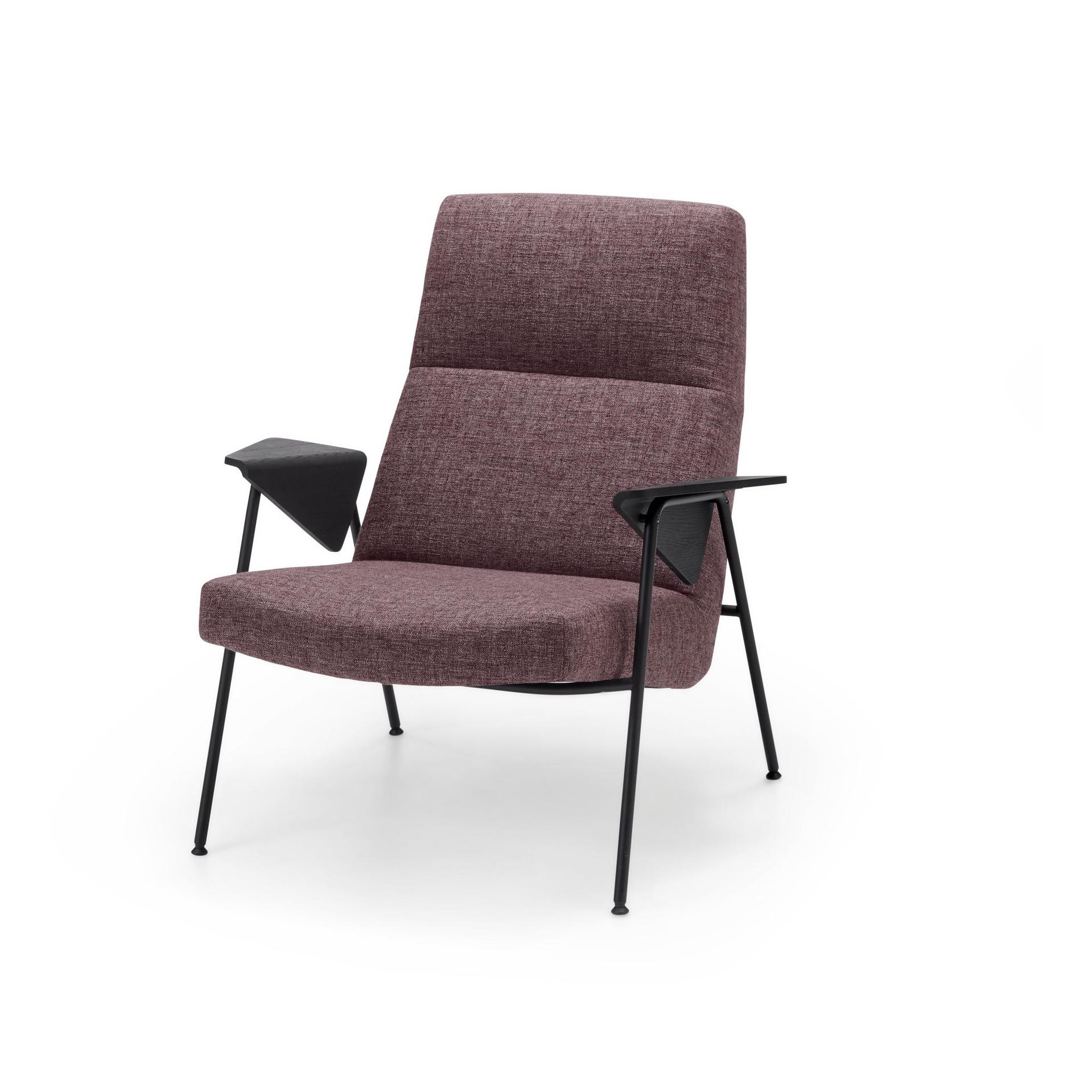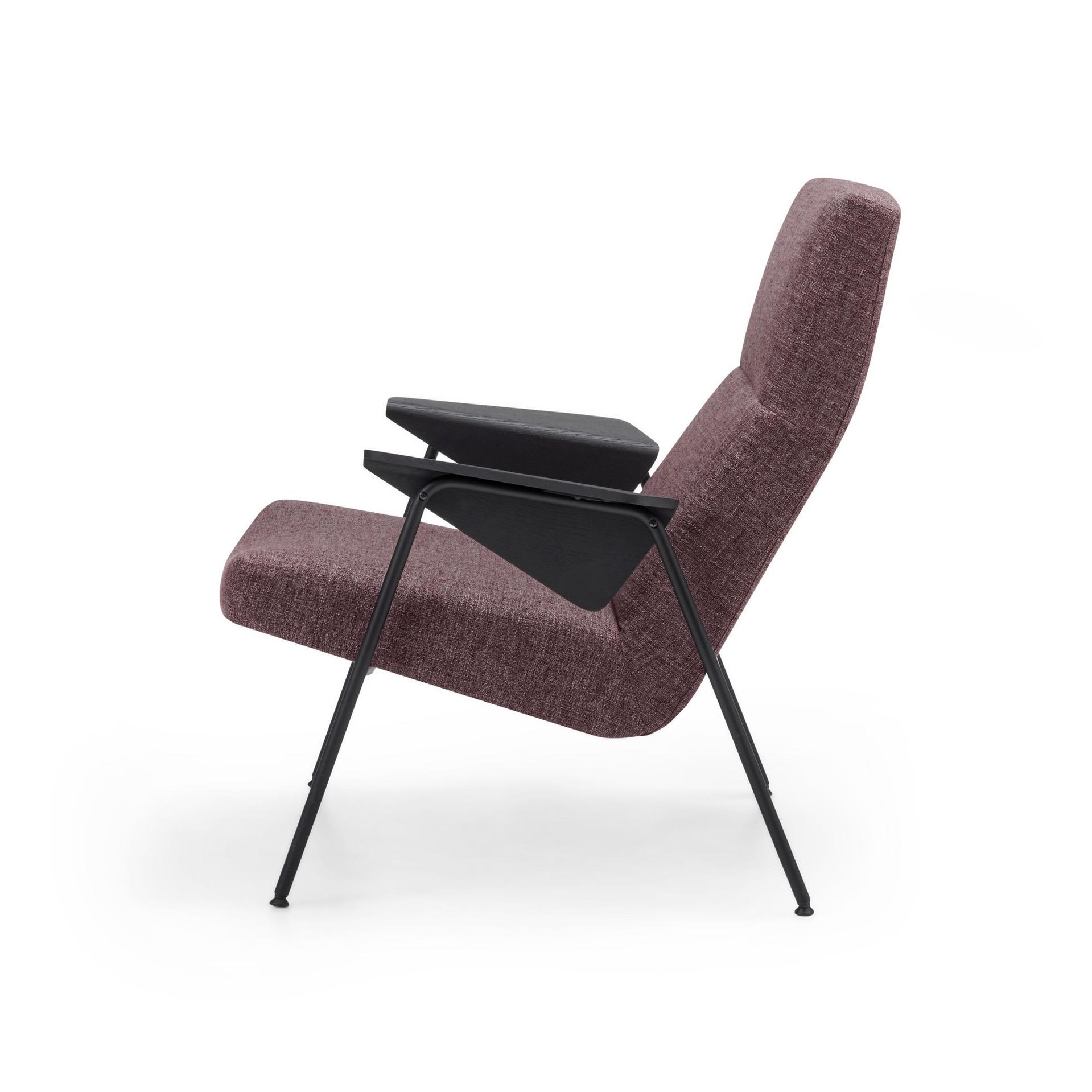 - niedriger Rücken, Bezug Stoff Gaia (PG 25) 7887 amethyst, Gestell schwarz matt pulverbeschichtet, Armlehne Eiche geflammt