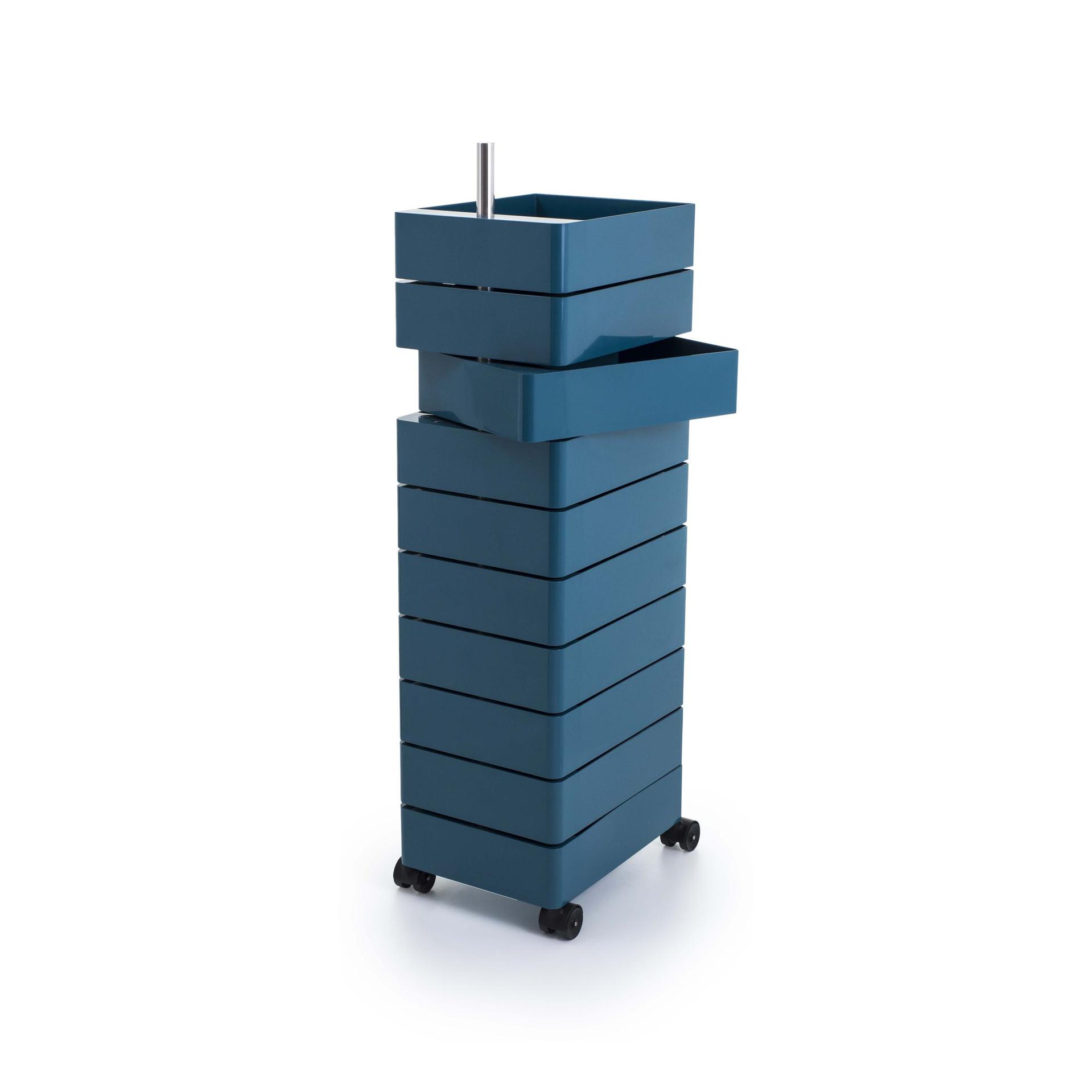 Die 360° Rollcontainer lösen sich von der Form und der Bedienung der klassischen Rollcontainer. Wie beim einem Fächer drehen sich die Schübe um eine Achse. Im Gebrauch können so mehrere Schübe gleichzeitig geöffnet und zugänglich sein.