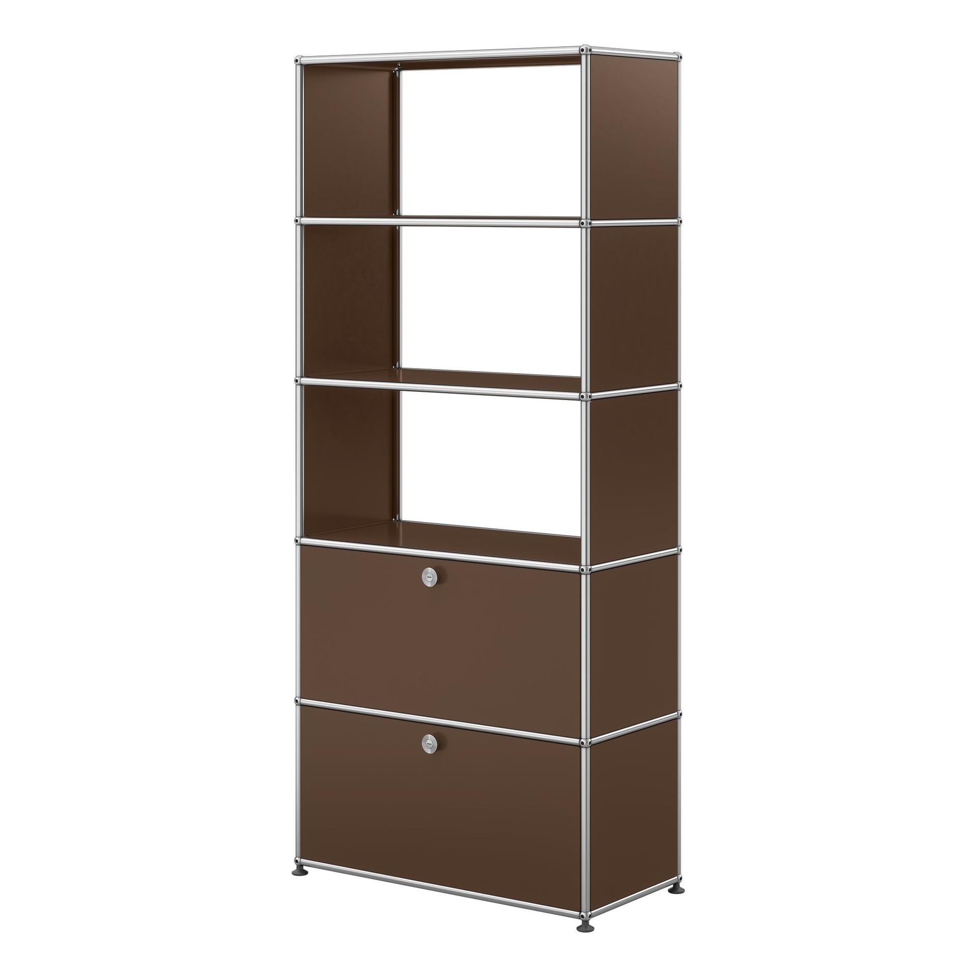 Regal von USM, Struktur verchromt, Tablare und Seitenwände farbig beschichtet.
