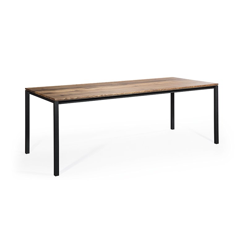 Mit einer Holzplatte und einem pulverbeschichteten Stahlgestell ausgeführt wirkt er wohnlich, mit einer Platte aus HPL dagegen kühl und reduziert. Kombiniert mit einem feuerverzinkten Stahlgestell lässt sich die HPL-Variante auch im Outdoor-Bereich verwenden.