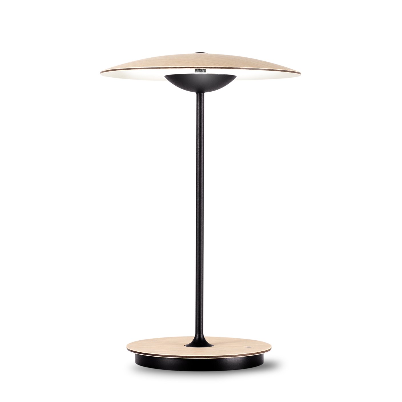 Mit ihrem Schirm aus 4 mm starkem Schichtholz in Natureiche oder Wenige ist sie ein besonderes Stück. Im Fußinneren befindet sich eine Batterie mit 5 Stunden Leistungsdauer bei maximaler Lichtstärke. Ein 3-Stufen-Dimmer sorgt für das gewünschte Maß an Licht, sehr schön und frei beweglich.