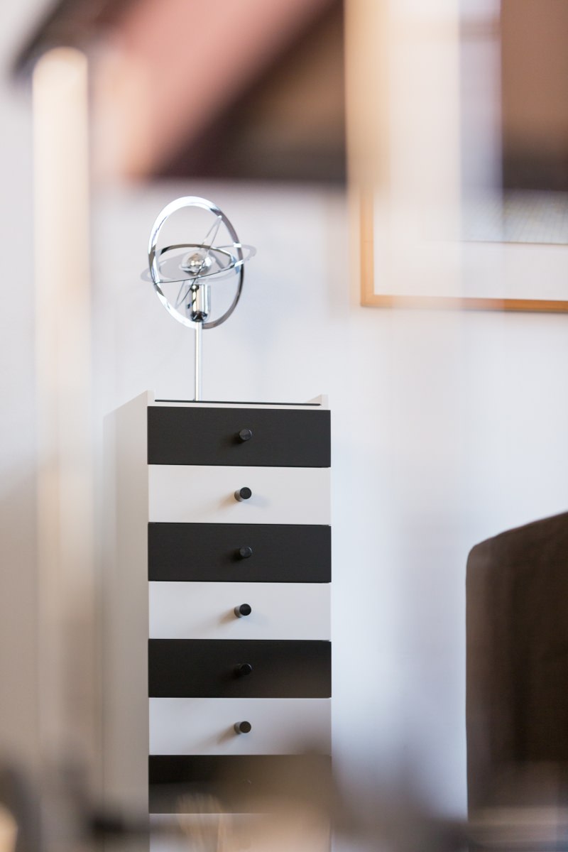 Mit ihren abwechselnd anders farbigen Schubladen erinnert die Kommode an ein Streifenhörnchen und gibt dem Raum ein spielerisches, dennoch klassisches Aussehen. Der Korpus kann entweder in schwarzer oder in weißer Farbe gewählt werden. Abgeschlossen wird die Kommode mit einer Glasplatte, die der Kommode den richtigen Grad an Eleganz verleiht. Durch die unten an der Kommode angebrachten Rollen, kann die S43 leicht bewegt werden und bietet so Flexibilität für Ihren Raum.