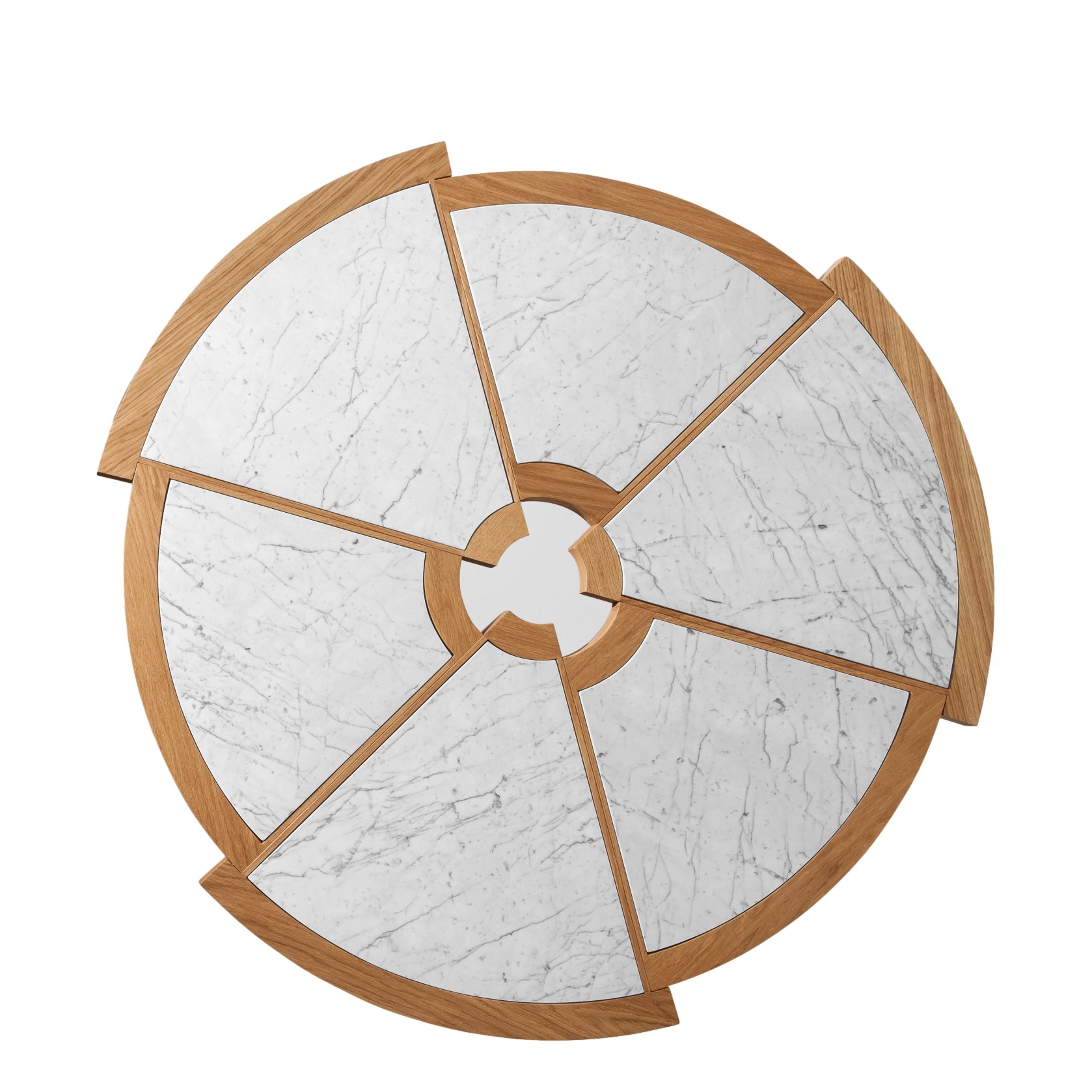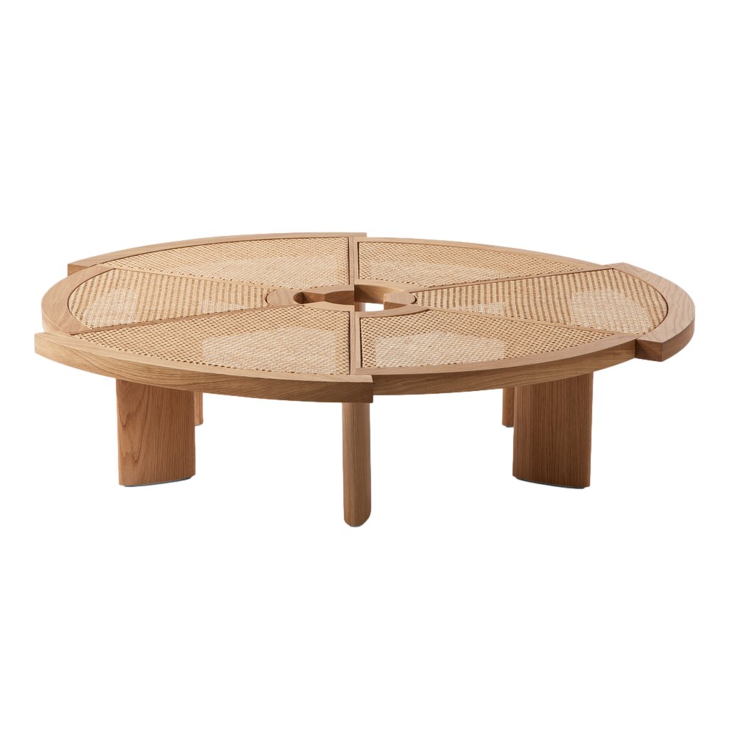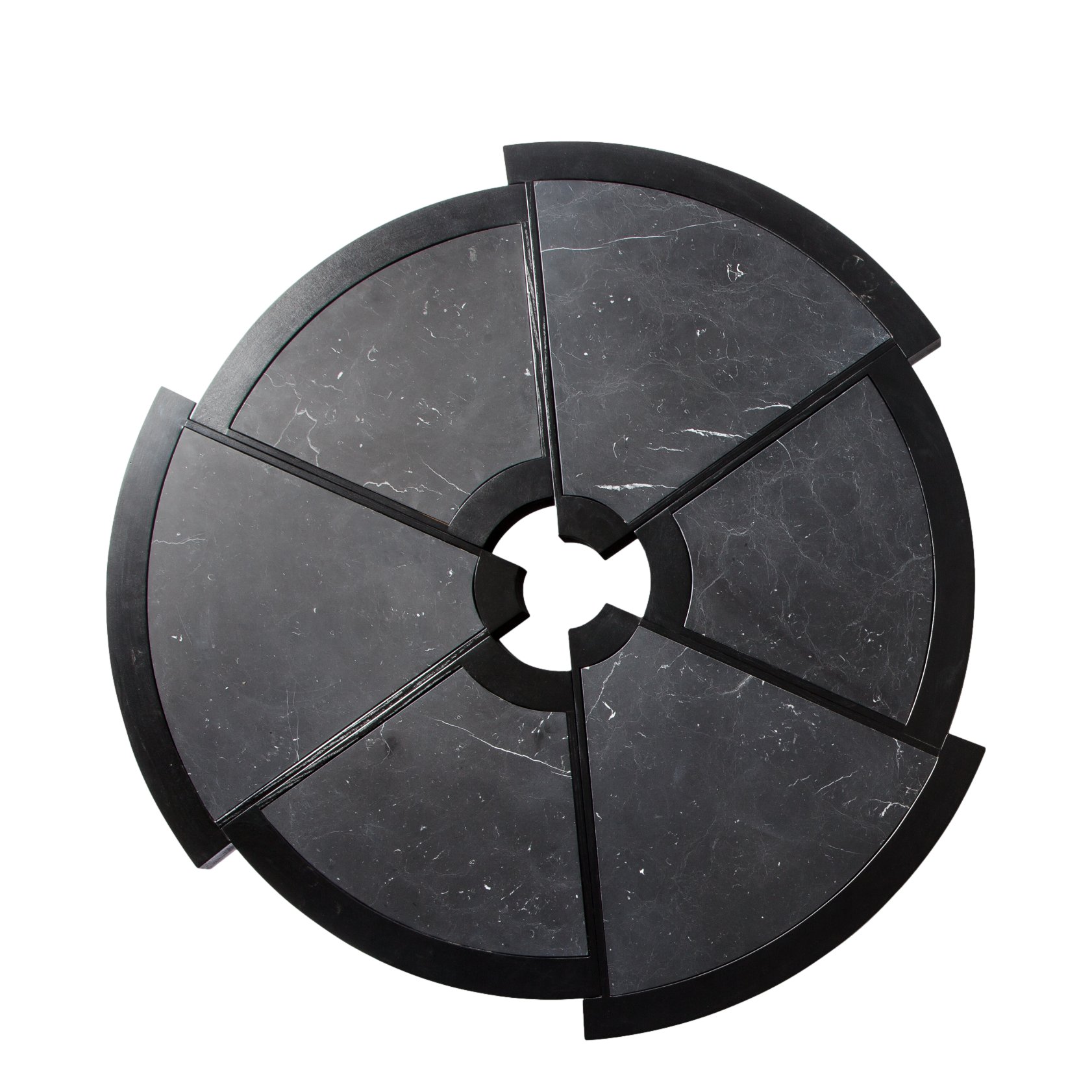 Der Couchtisch Rio von Charlotte Perriand besteht aus sechs Kreissegmenten mit unterschiedlichen Radien, die versetzt zusammengefügt sind.