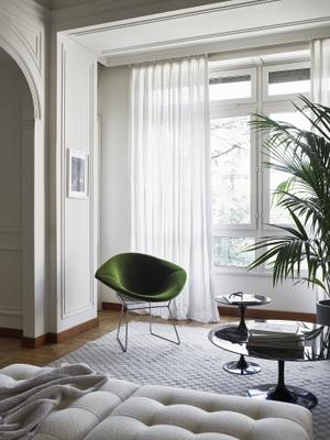 Harry Bertoia, ursprünglich aus der Schmuckherstellung kommend, entdeckte seine Leidenschaft für Metallverarbeitung, als er bei Knoll begann. Er experimentierte intensiv mit dem Material und schuf mit dem Diamond Sessel ein Design, das universell einsetzbar ist. Sein Ziel war es, einen Stuhl zu gestalten, der sich harmonisch in jedes Zimmer und jedes Dekor einfügt.