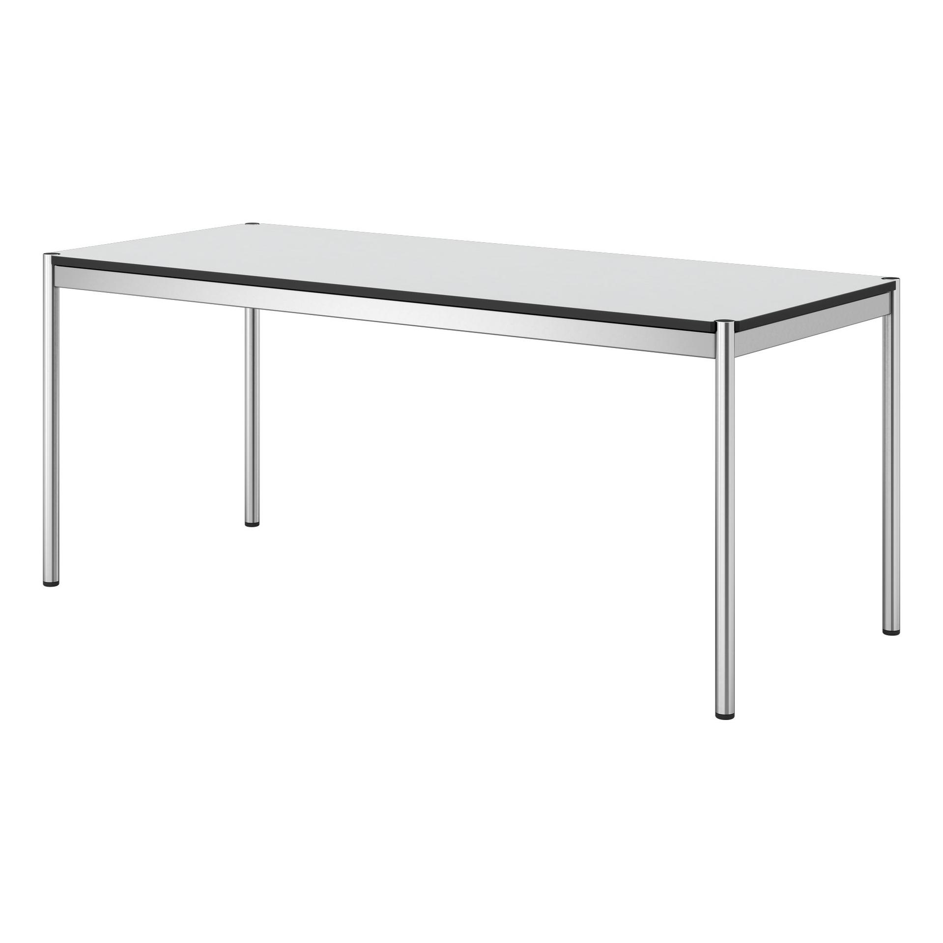 Der Tisch von USM. Rechteckig, mit verchromtem Gestell und mit drei verschiedenen Tischplatten wählbar.