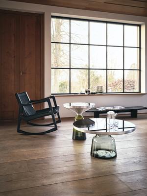 Der Beistelltisch Bell von Sebastian Herkner ist ein Meisterwerk traditioneller Handwerkskunst. Er erinnert an den eleganten Schwung einer Glocke mit reizvollen Reflexionen. Die Materialkontraste lassen ihn zu einem charakterstarken Element werden.