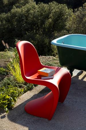 Dieser Möbelklassiker wurde in Zusammenarbeit zwischen Verner Panton und Vitra zur Serienreife entwickelt. Es hat seit 1960 schließlich mehrere Produktionsphasen benötigt, bis im Jahre 1999 die optimale Kombination aus Materialien und Form gefunden wurde. Die Wahl für durchgefärbten Kunststoff mit einer mattglänzenden Oberfläche macht ihn nicht nur strapazierbar, sondern auch zu einem preiswerten Designerstück.