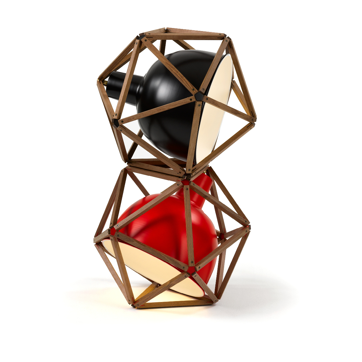 Der klassische Industrielampenschirm wird bei der Block 2 Leuchte von dreißig Massivholzstäben in gedämpfter Akazie umschlossen und erhält so einen geometrischen Rahmen, der vielseitiges Positionieren ermöglicht.