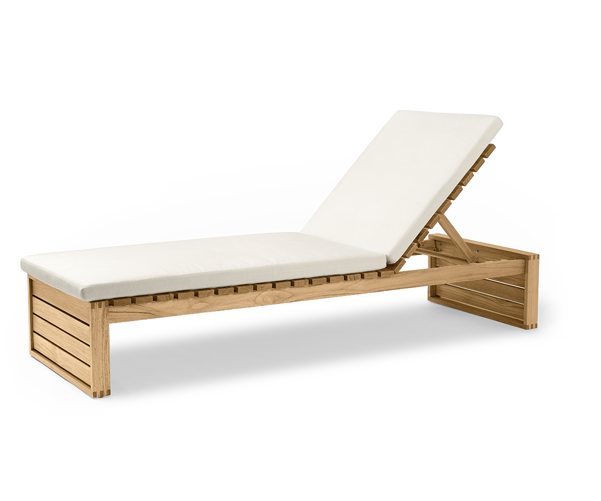 Dieses Möbel ist Sonnenliege, Bank und Couchtisch zugleich. Die Funktion der neigbaren Kopfstütze ist versteckt.