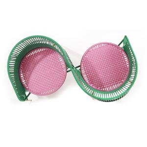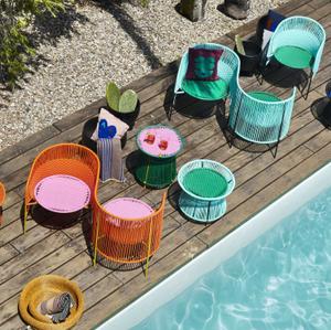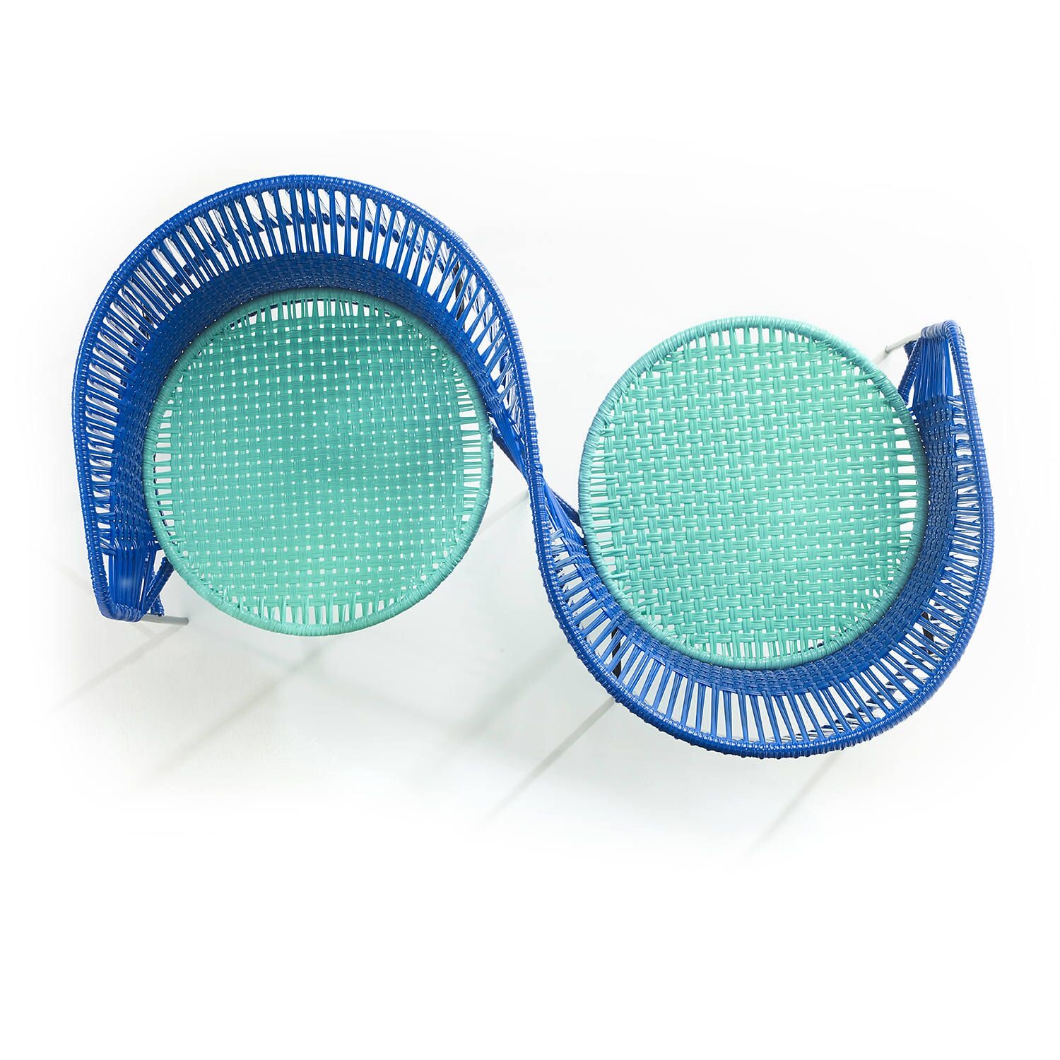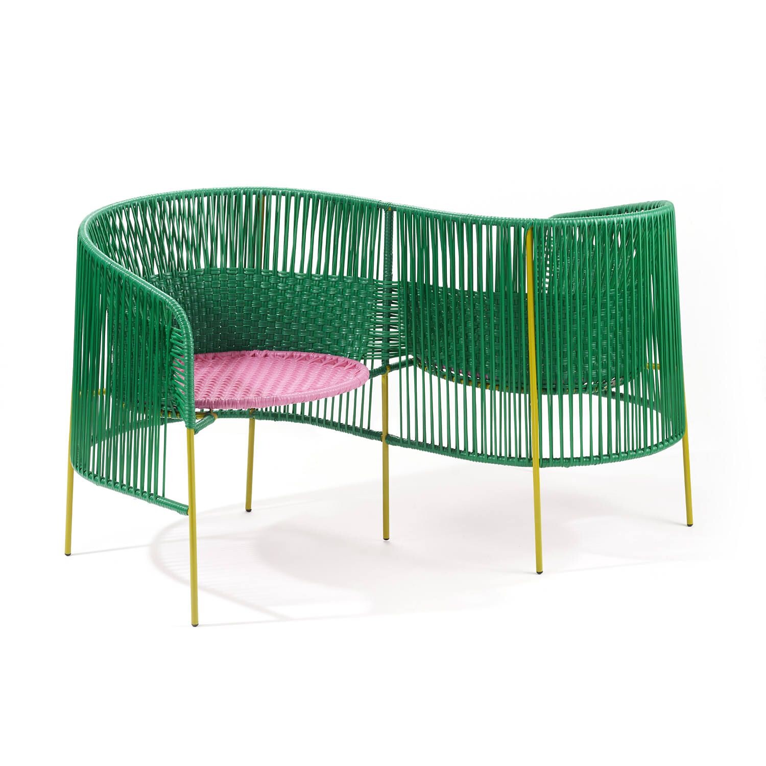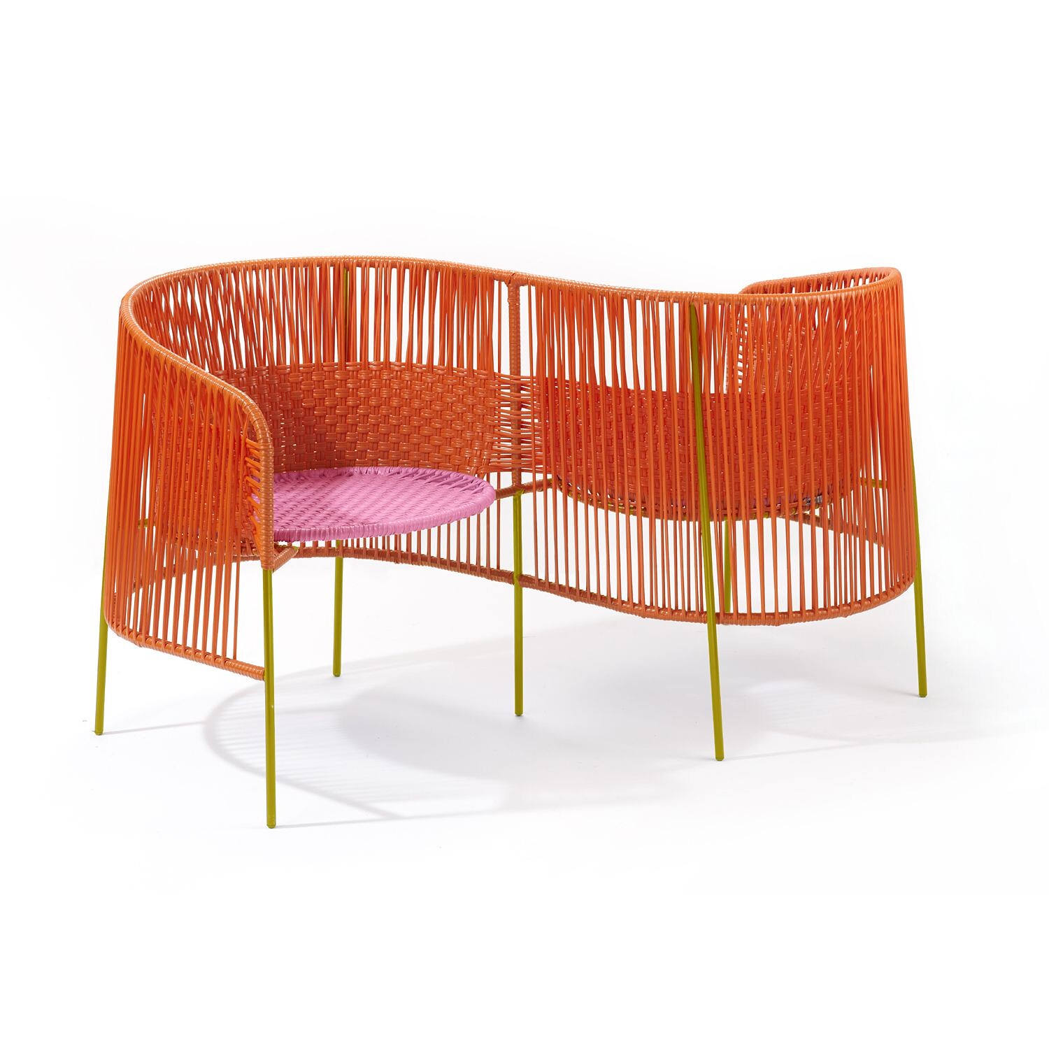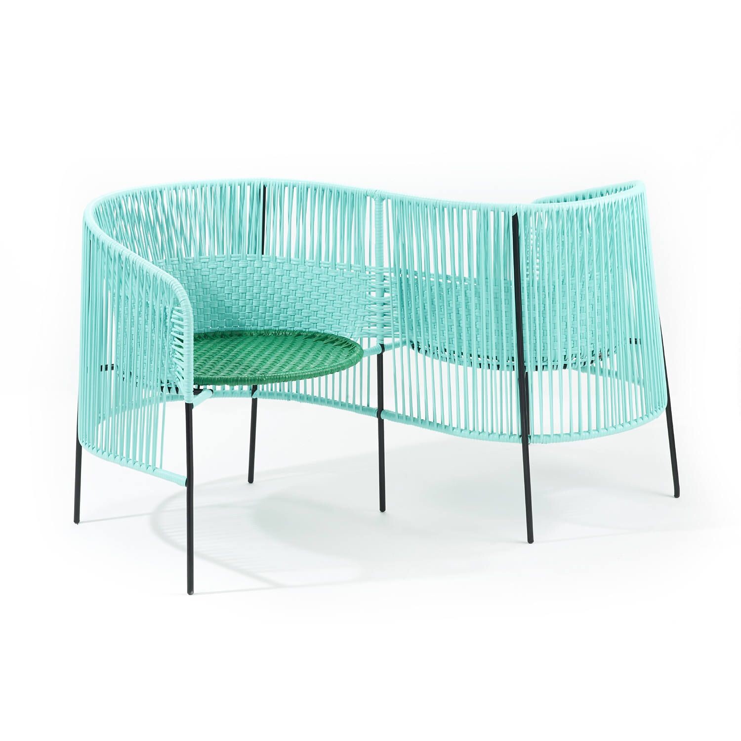 Die organische Form der Caribe Bank Vis A Vis passt zu den verspielten Farbkombination dieser Outdoorserie, die mit ihren bunten Kunststoff-Fäden Lust auf Sommer machen.