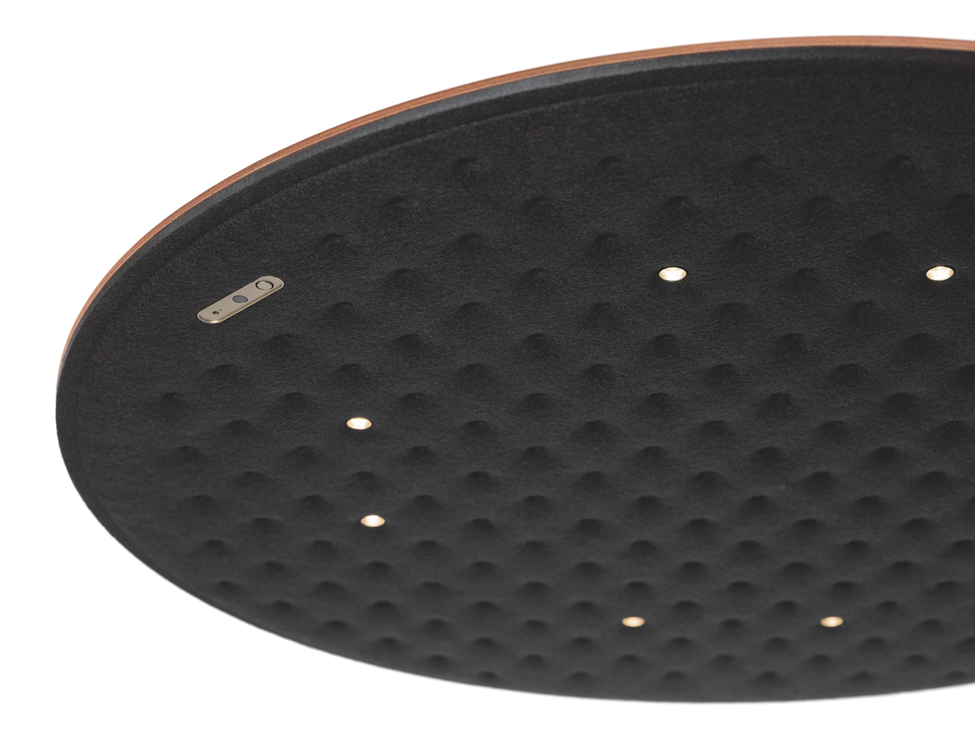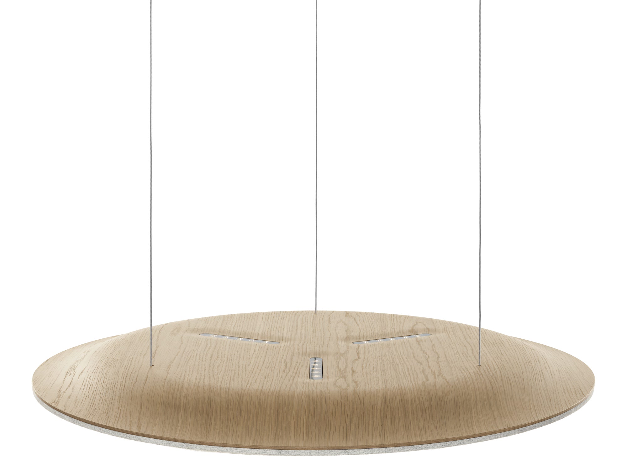 Die harmonische Kombination aus edlem Holz und schallabsorbierendem Formvlies verleiht der Licht-Akustik-Leuchte ein behagliches und elegantes Ambiente.