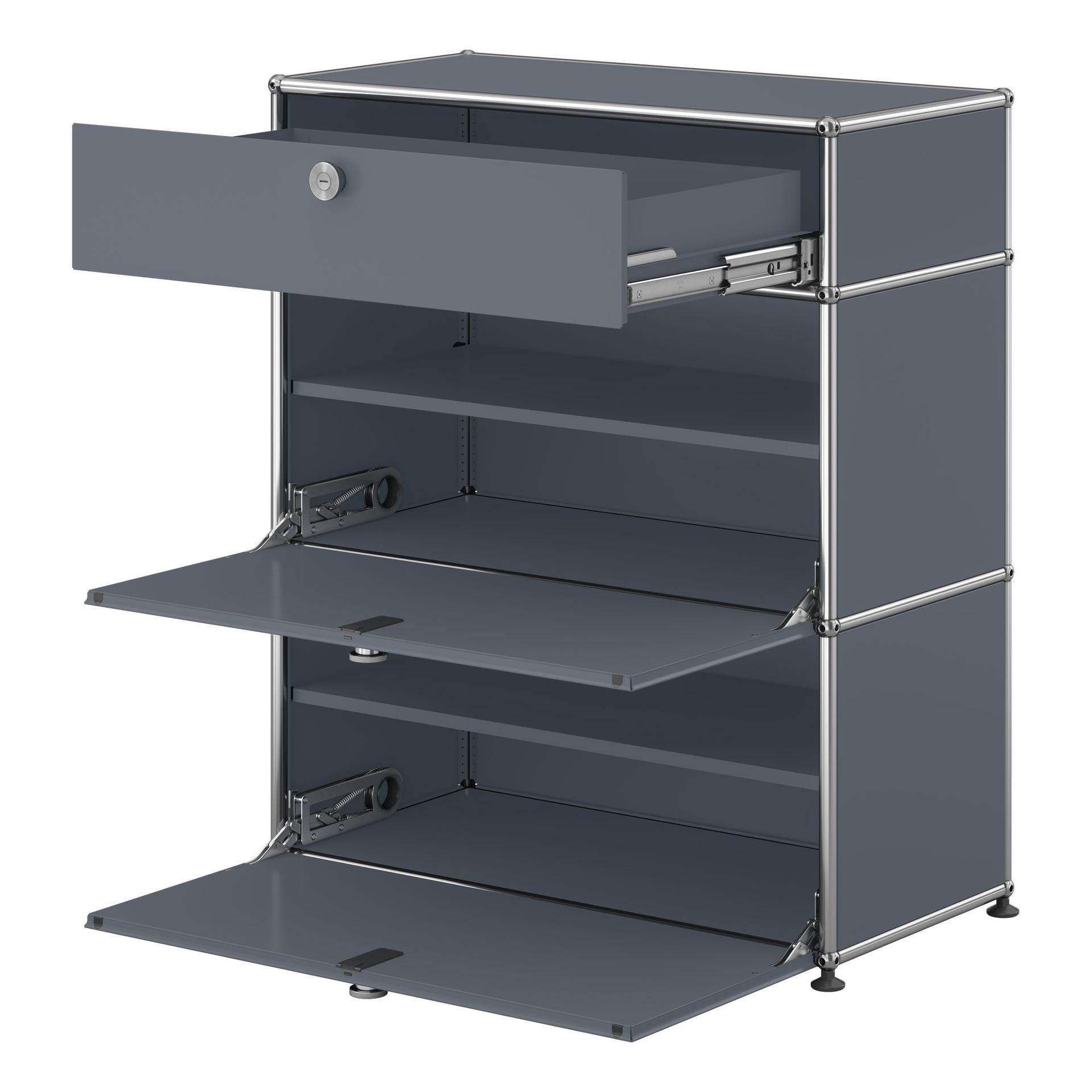 Das modulare Möbelbausystem USM Haller steht seit über 40 Jahren für maßgeschneiderte Lösungen. Aus wenigen Elementen entstehen Möbel für den Wohnbereich, komplette Arbeitsplätze für zu Hause und funktionale Bürolandschaften. In diesem Fall ein Sideboard mit Klapptüren.