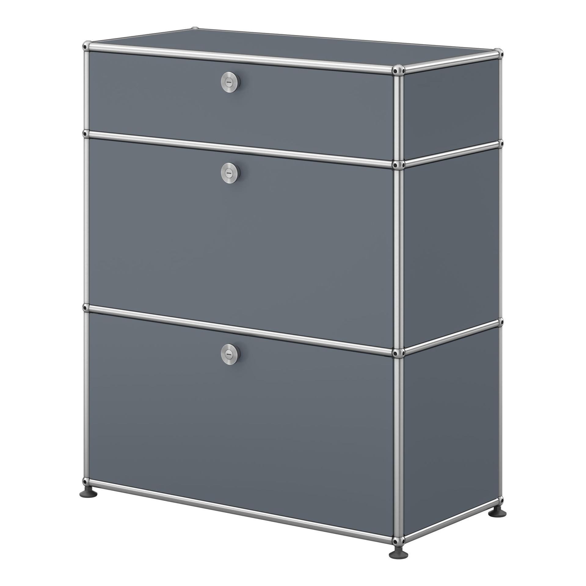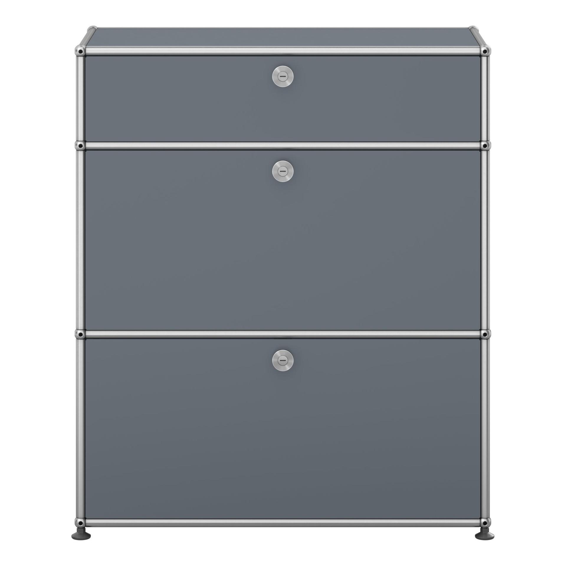 Schmales Sideboard von USM mit zwei Klapptüren, zwei Zwischentablaren und einer Ausziehtür mit Einlegerahmen, inklusive Regal-Verankerungs-Set.