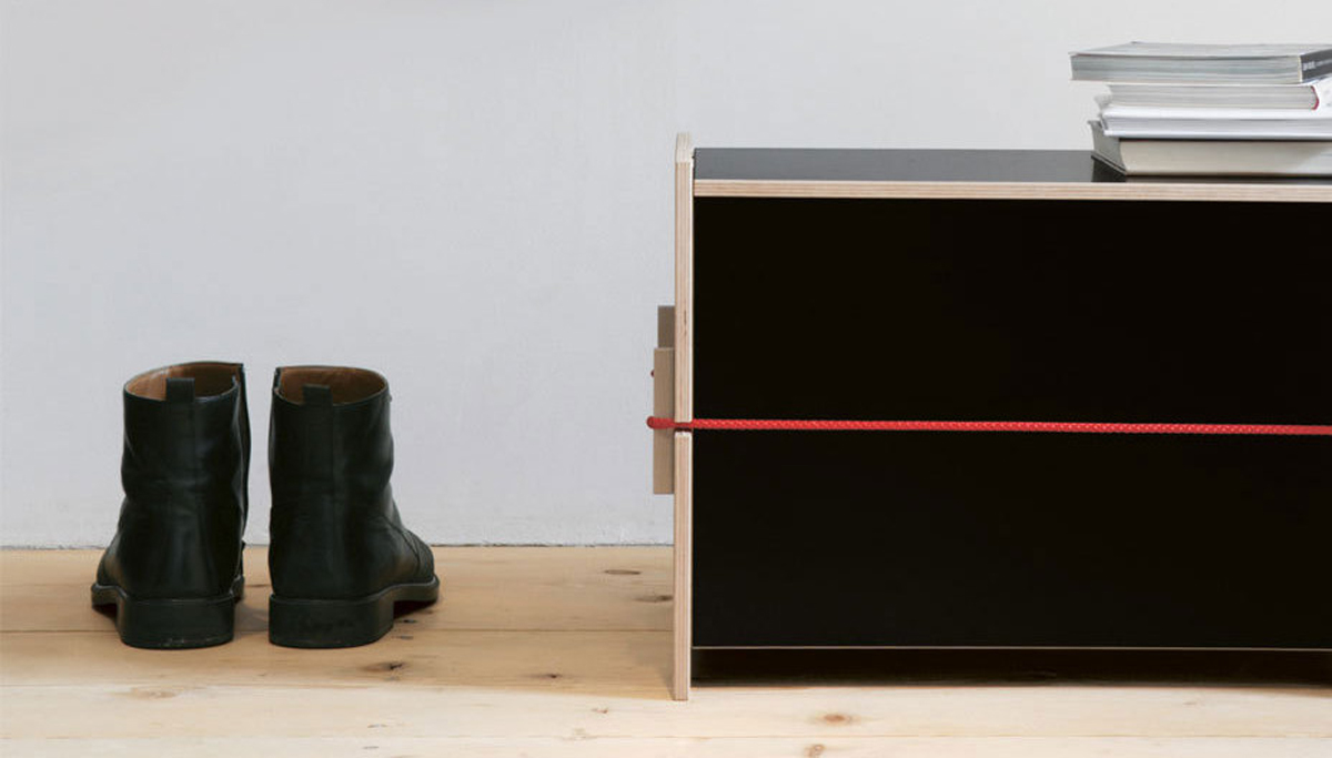 Die kleinste der Trude-Truhe ist ein Design von Nils Holger Moormann. Ein gespanntes rotes Seil, das sich um die zwei längsten Wände der Truhe legt und so für Stabilität sorgt, hebt die minimalistische Formsprache des Produkts hervor. Trude wird vom Hersteller in höchster Verarbeitungsqualität produziert.