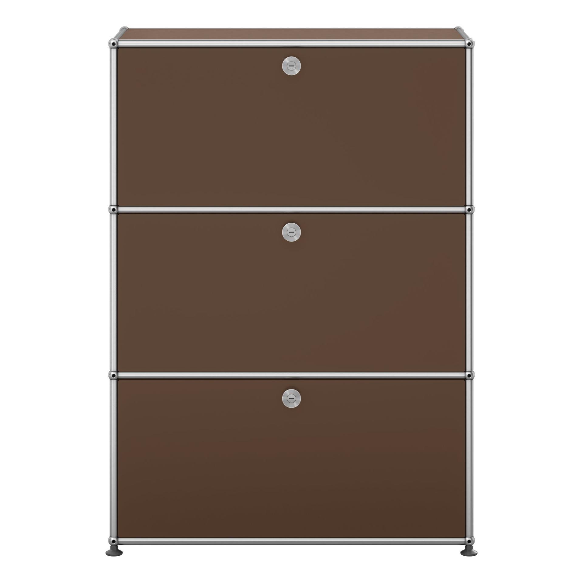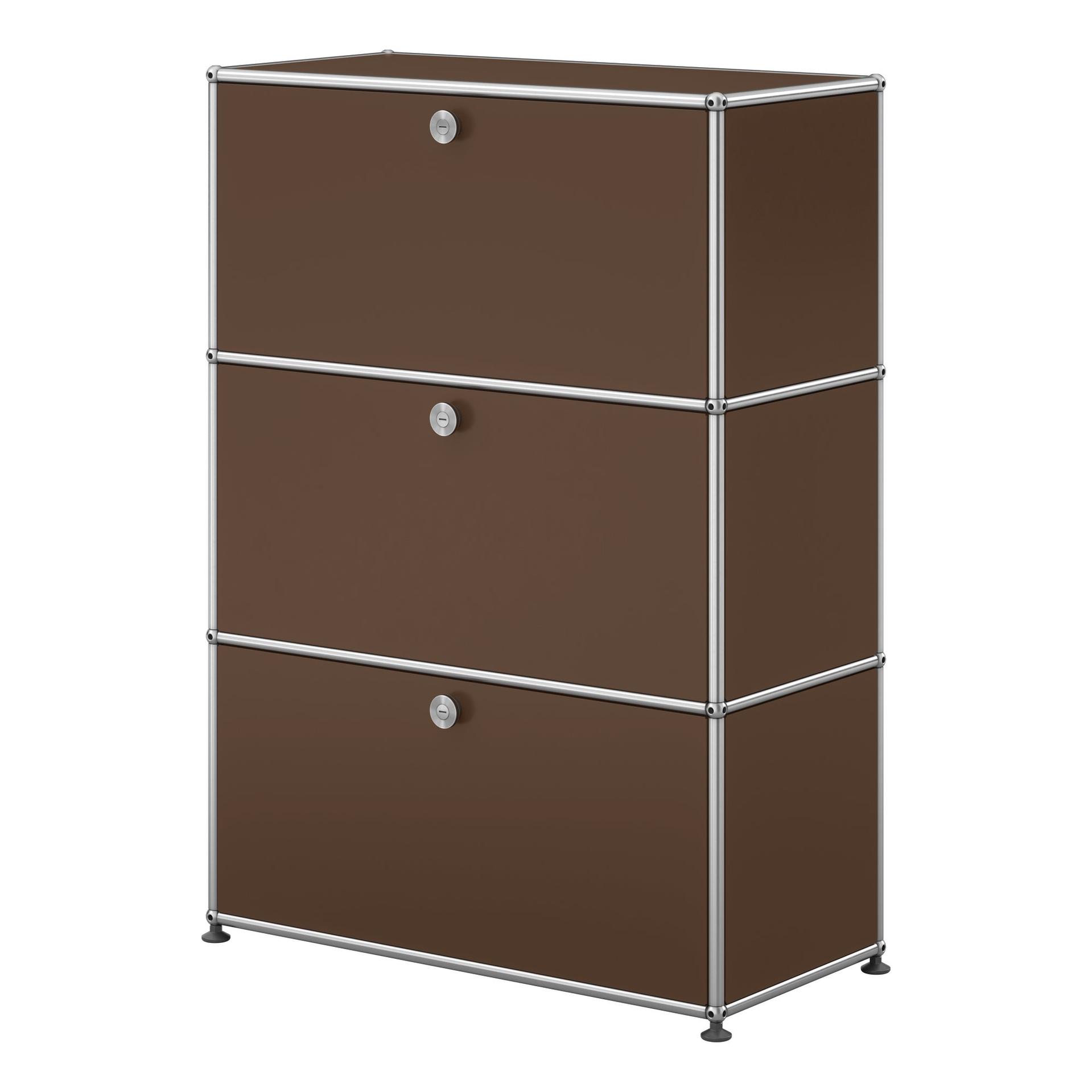Das modulare Möbelbausystem USM Haller steht seit über 40 Jahren für maßgeschneiderte Lösungen. Aus wenigen Elementen entstehen Möbel für den Wohnbereich, komplette Arbeitsplätze für zu Hause und funktionale Bürolandschaften. In diesem Fall eine Kommode mit drei Klapptüren.
