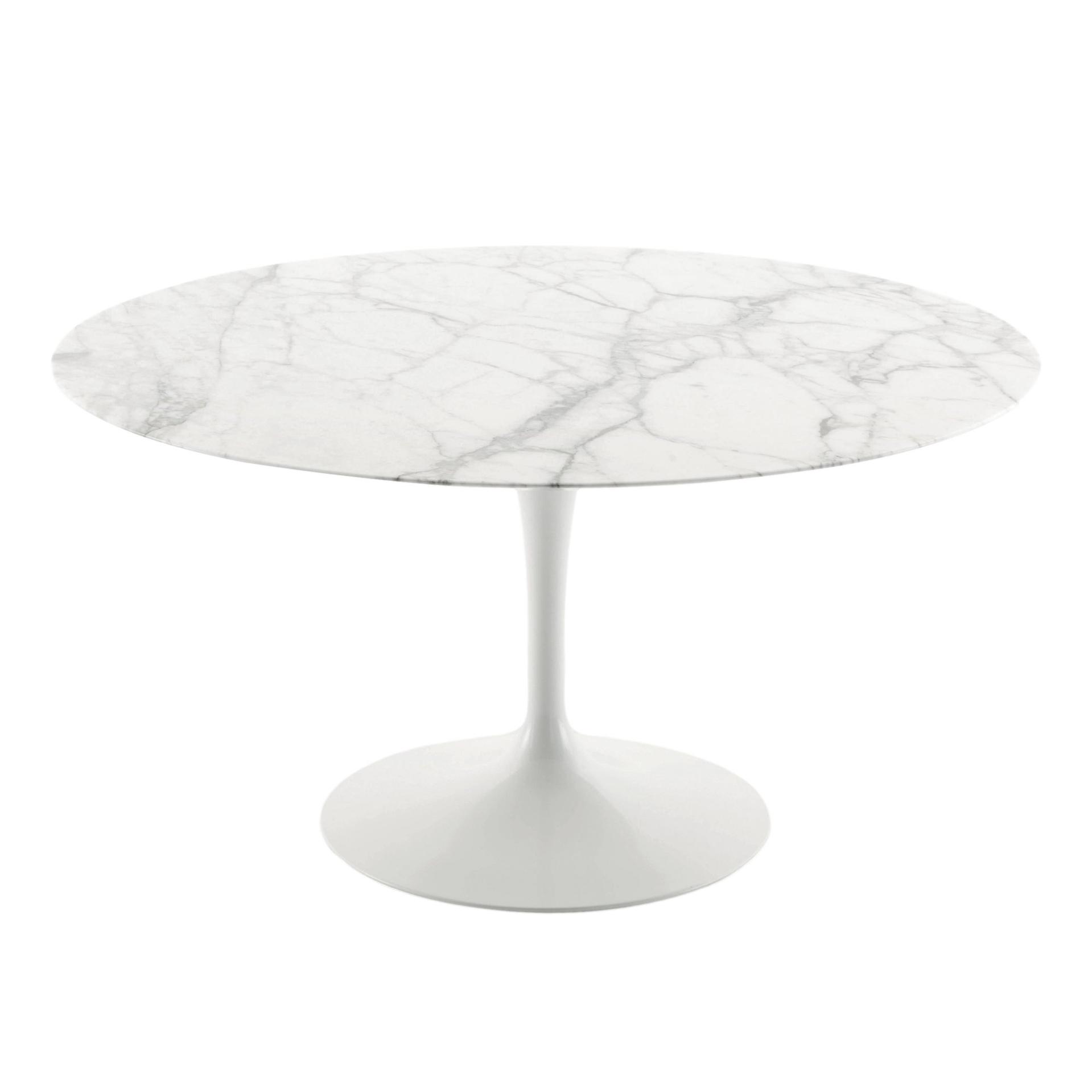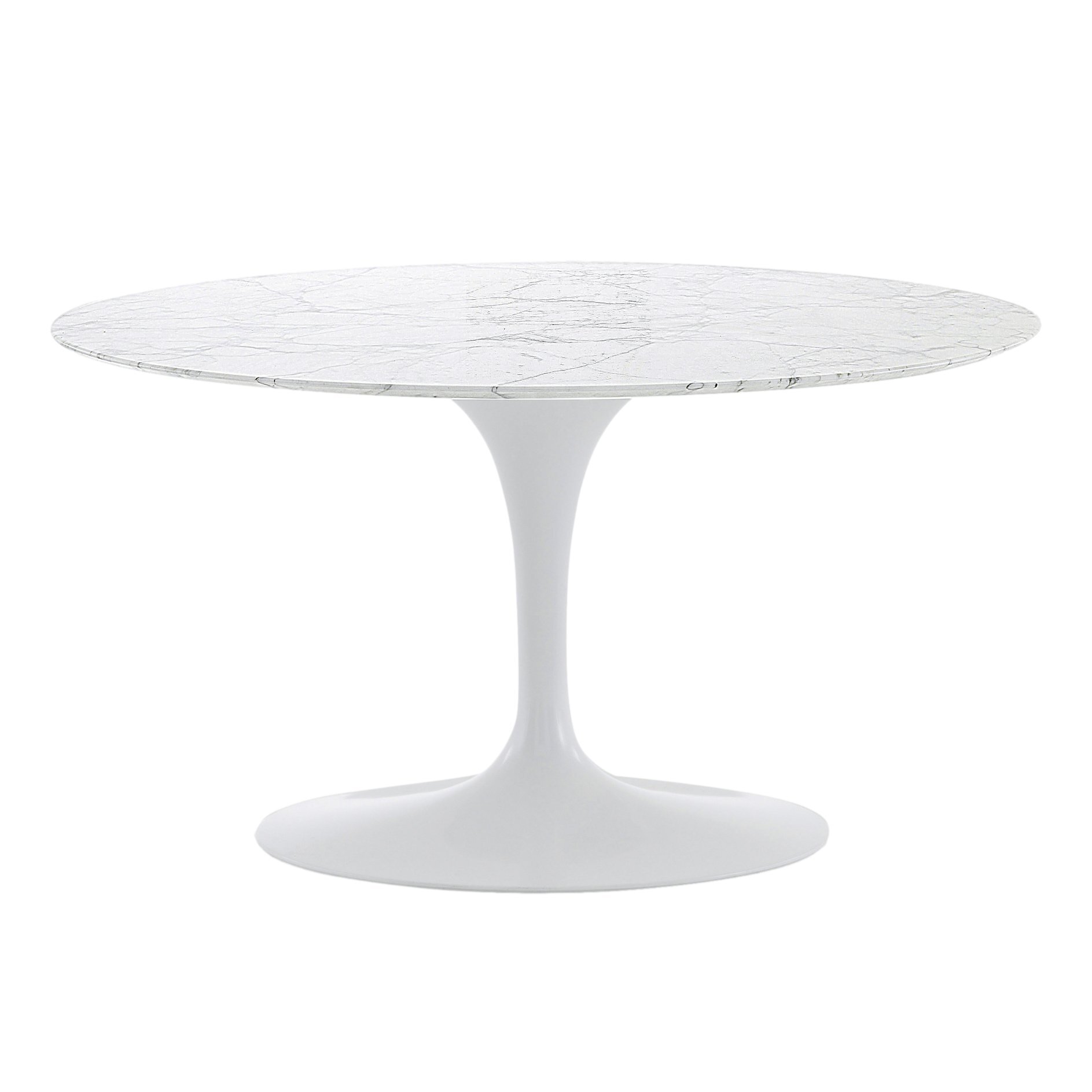 Der Saarinen Esstisch zählt seit 1957 zu den Designklassikern und imponiert dank des zentrierten Fußes mit Leichtigkeit und viel Beinfreiheit. Es ist von Eero Saarinen ein Kontra zu den verwirrenden und unruhigen Tischbeinen.