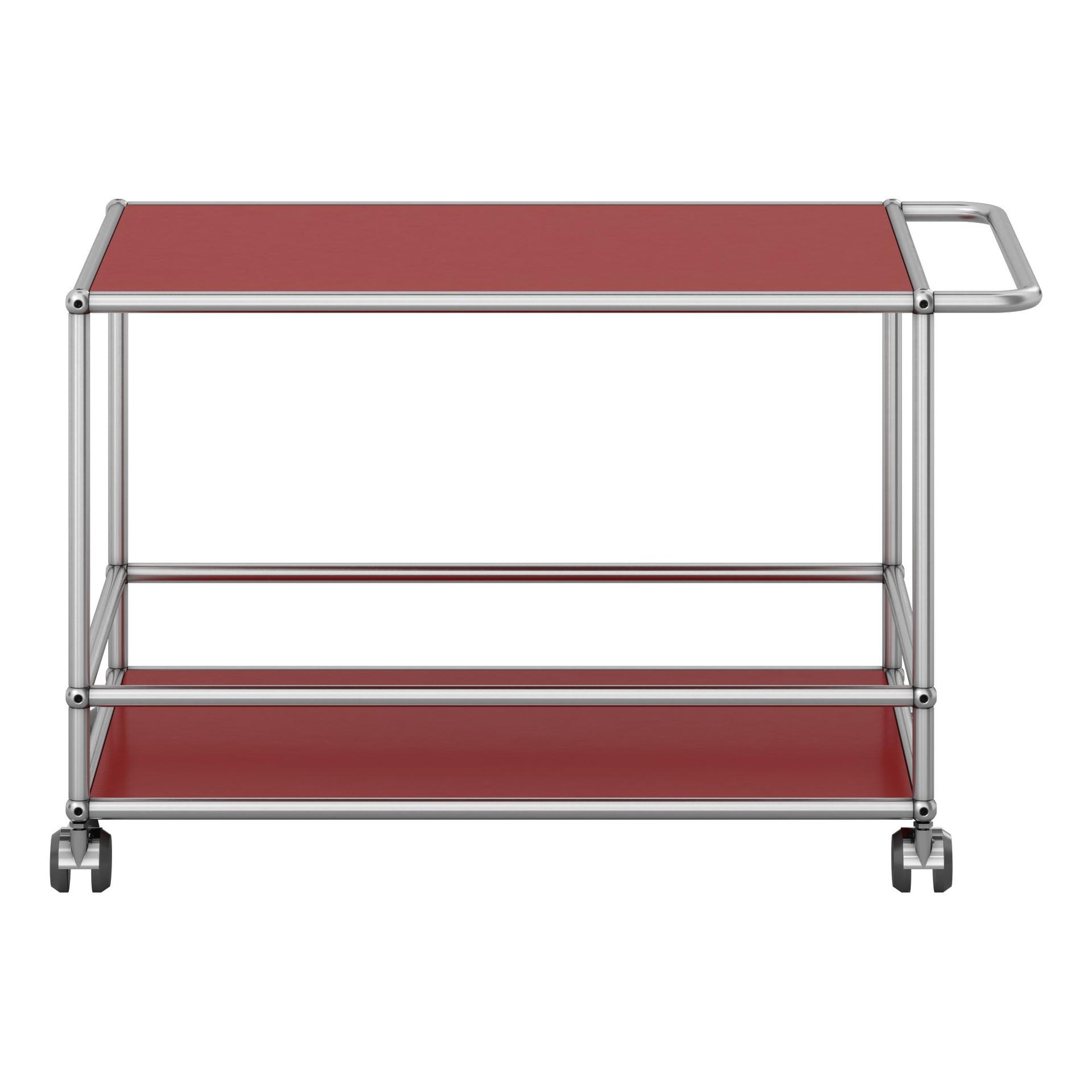 Der Servierwagen von USM mit einem Griff und Rollen. Struktur verchromt, Tablare farbig beschichtet.