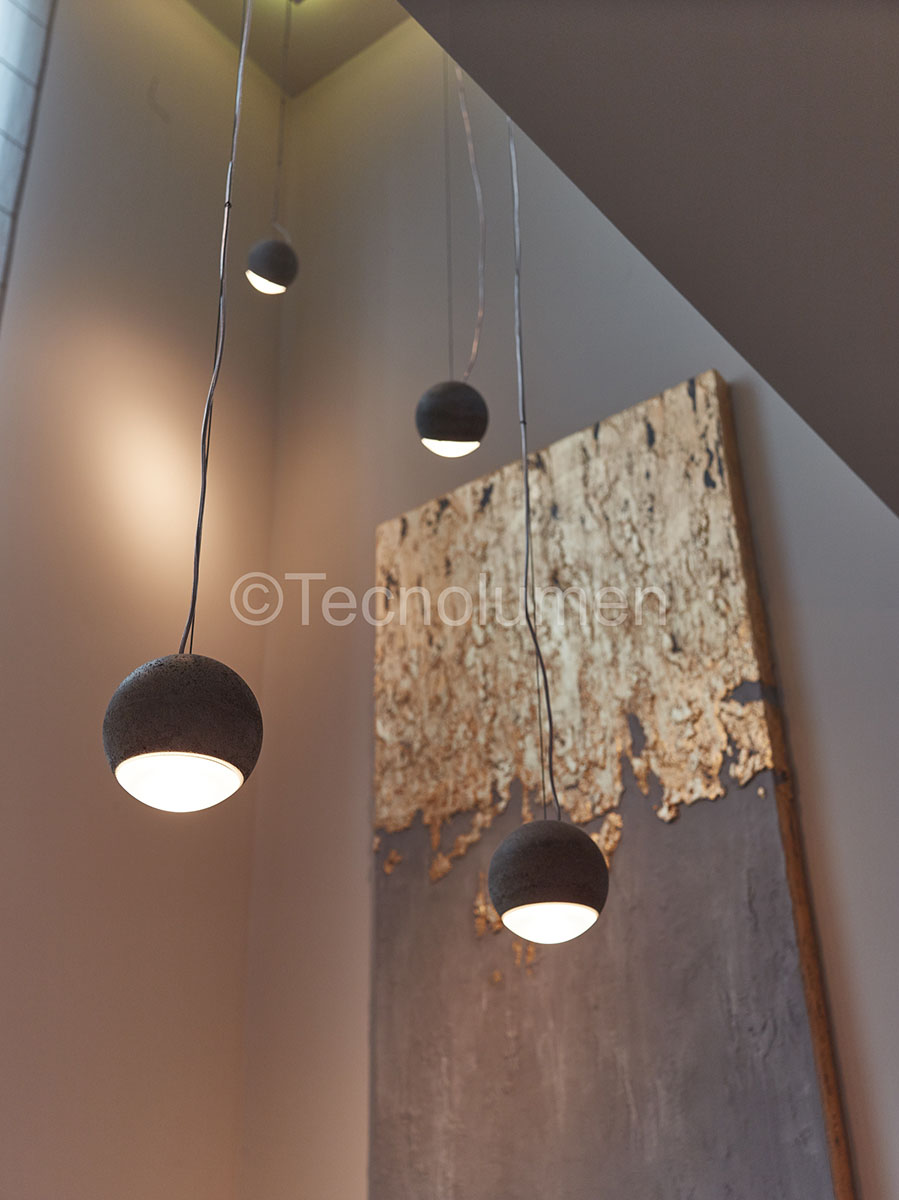 Für Tecnolumen entwirft der Designer eine Leuchte, die nicht nur optisch, sondern auch funktional überzeugt. Dabei verzichtet Joachim Manz bewusst auf eine maschinelle Verdichtung des verwendeten Betons und lässt so jede seiner Leuchten zu einem wertvollen Unikat werden. Für eine blendfreie Lichtverteilung sorgt eine Glaslinse, die von unten in die fixierte Kugel eingesetzt wurde.