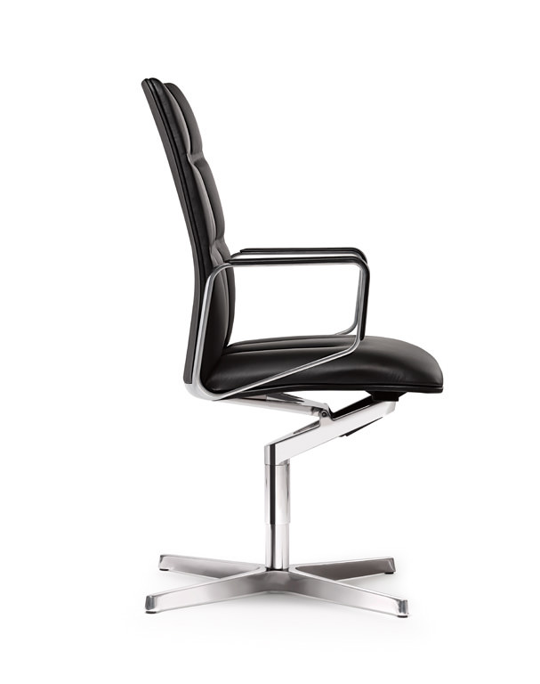 Das klare Erscheinungsbild dieses Konferenzstuhls setzt sich aus mehreren Faktoren zusammen. Fließende Formen modulieren das elegante Polster mit herrlich weichem Leder. Fußkreuz, Drehsäule, Sitz- und Rückengabel sowie die Armlehnen scheinen aus einem Guss. Hohe Funktionalität durch die Synchronmechanik ist gewährleistet.