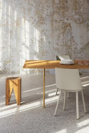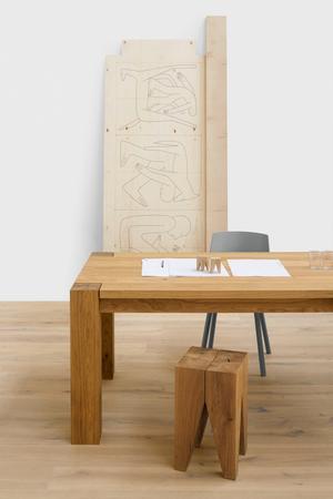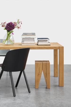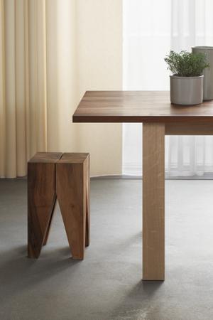 Hocker Backenzahn ist als ikonisches Erkennungszeichen von e15 weltbekannt. Eine Mulde in seiner Holzfläche sorgt für ein angenehmes Sitzerlebnis.