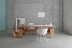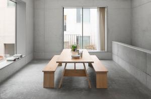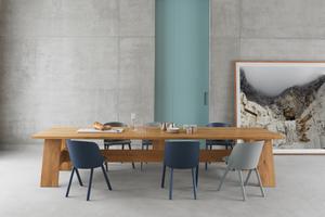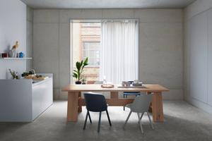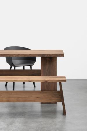 Das Design des Tisches stellt die konstruktiven Elemente in den Fokus: Die Mittelzarge mit dem Holm verleiht Stabilität, während die Tischplatte über den Rahmen hinausragt und so zusätzlich Sitzmöglichkeiten an den Stirnseiten eröffnet.