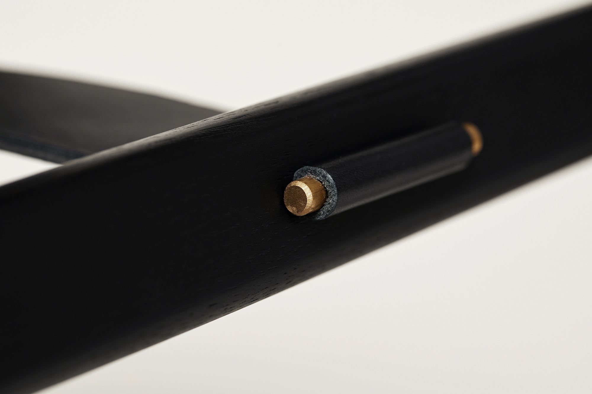 Angle ist äußerst bequem, da die Seiten der Sitzfläche jeweils 10 Grad angewinkelt sind. Das Lederband unter dem Sitz, das von einer Messingstange festgehalten wird, rundet die besondere und auffällige Form des Hockers ab. Er ist in Eiche und schwarz gebeizter Eiche erhältlich. Der Hocker kann platzsparend zusammengeklappt werden und durch seinen massiven Messinghaken an einer Wand aufgehängt werden. Das massive Holz und die starken Streben zwischen den Beinen machen den Hocker zu einem sehr stabilen Möbelstück.