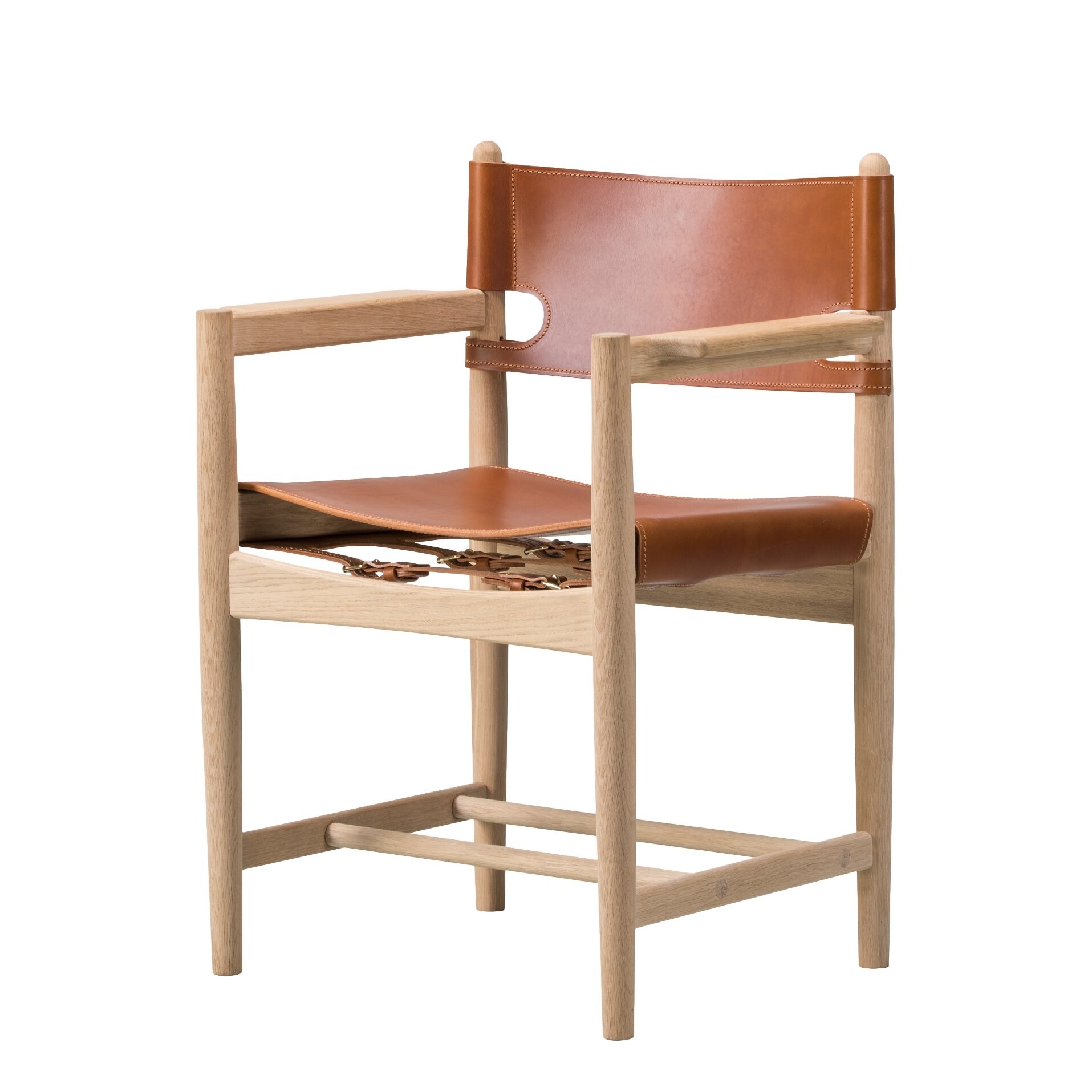 Bestes Eichenholz und makelloses Sattelleder ist die Basis für diesen außergewöhnlichen Stuhl: The Spanish Dining Chair. Inspiriert von den traditionellen spanischen Stuhltypen mit breiten Armlehnauflagen entwarf Børge Mogensen den Klassiker Mitte des 20. Jahrhunderts.